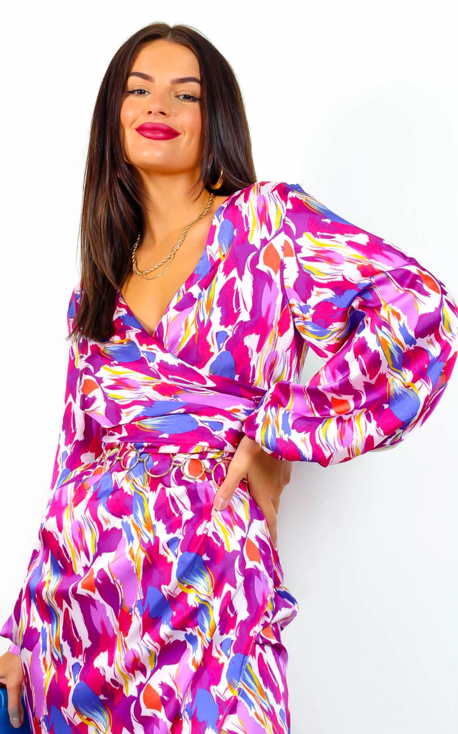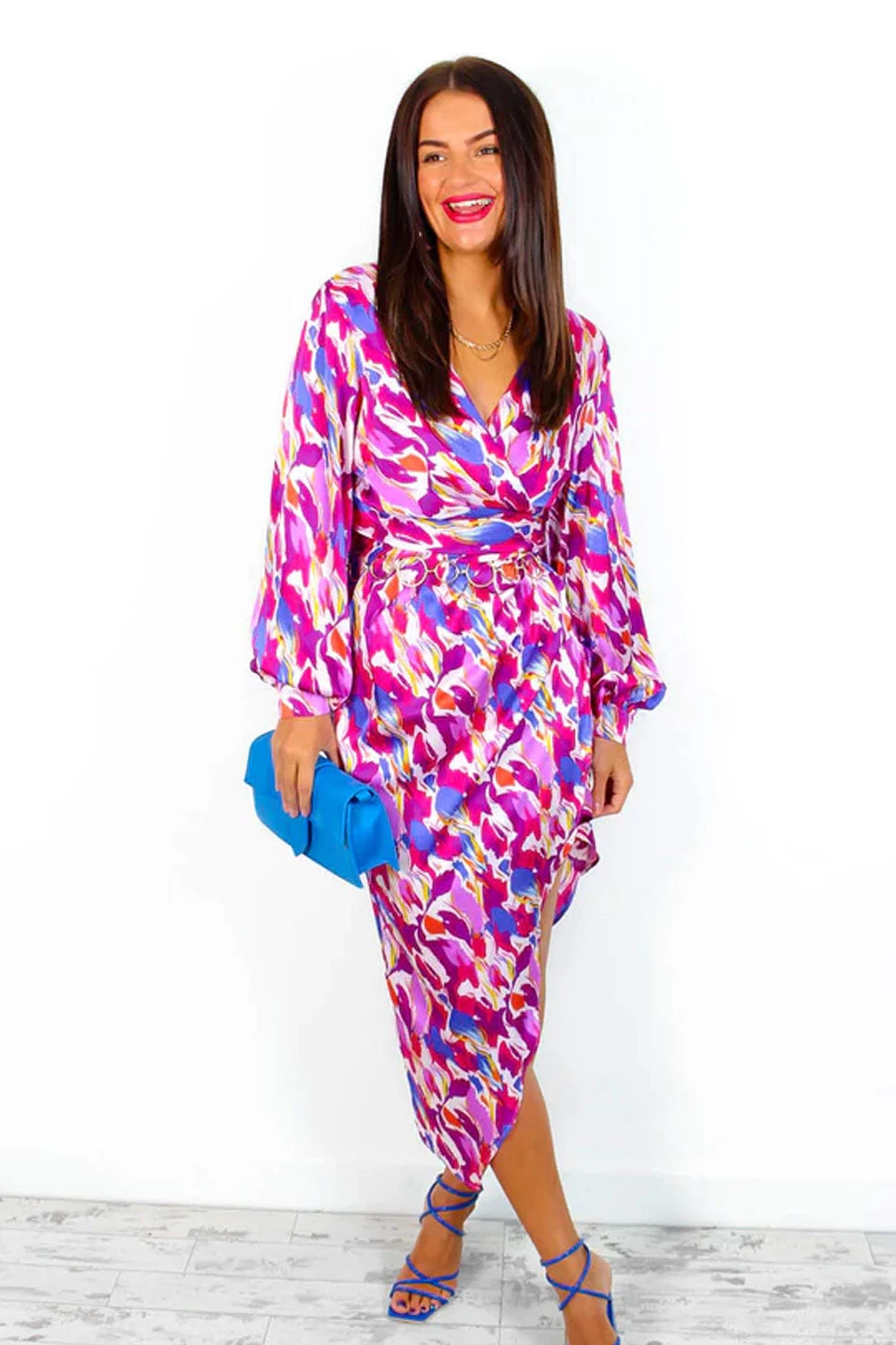 Classiest in the room – CHECK! This stunning dress boasts a brushstroke style abstract print in dreamy shades of pink and purple on a silky satin material. Complete with long, cuffed balloon sleeves, this midi dress also crosses over on the skirt creating a captivating leg split. Go an extra mile with cobalt accessories and be ready to catch those stares!Â