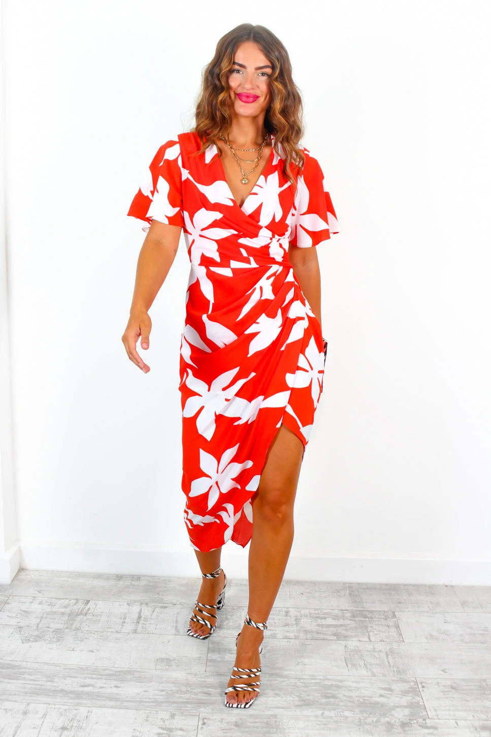 Wrap her up in flowers and watch her bloom! You’ll be the pick of the bunch in this Summer-reddy floral wrap dress. With a flattering wrap over style and blossoming red and white flower print, this sassy and classy floral satin midi dress features flouncy angel sleeves and a flirty leg split – in true DLSB style! Just add all-white accessories, glittering gold jewellery and a slick of scarlet lippy to unleash your inner flower power.
