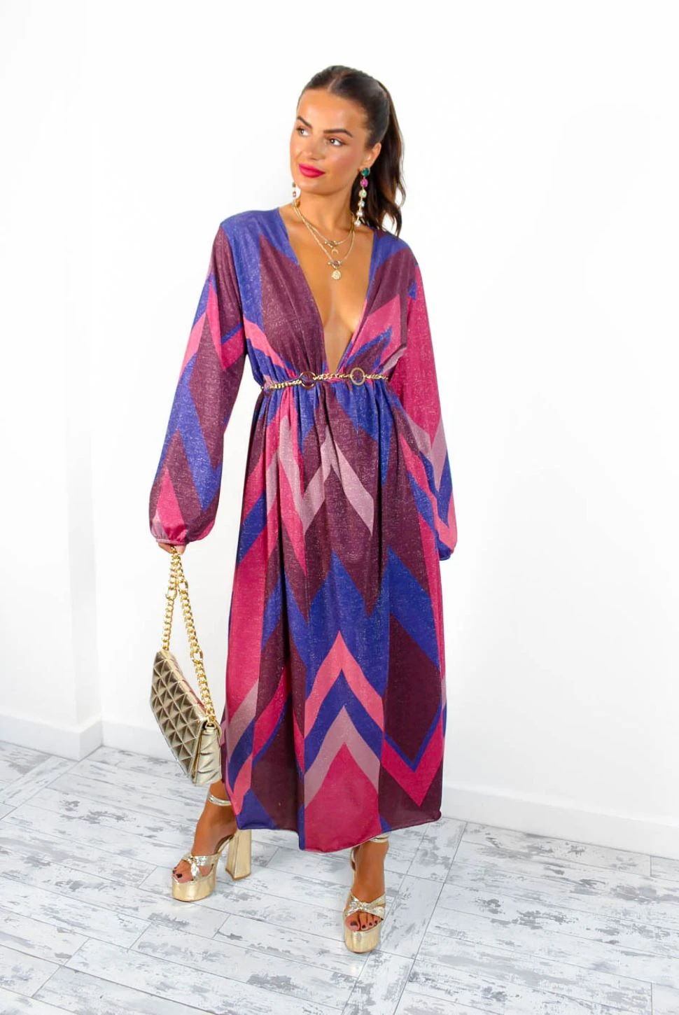 Fashion is a way of life. We love a little glitter in our lives and this geometric print midi is giving us just the right amount of cool and glam. Featuring a cross-over neckline, long loose sleeves with elasticated cuffs, an elasticated waist, and flowing hemline. Style with chunky pink trainers and a mini bag for a look perfect for day drinking… the vibe is dressy but casual.