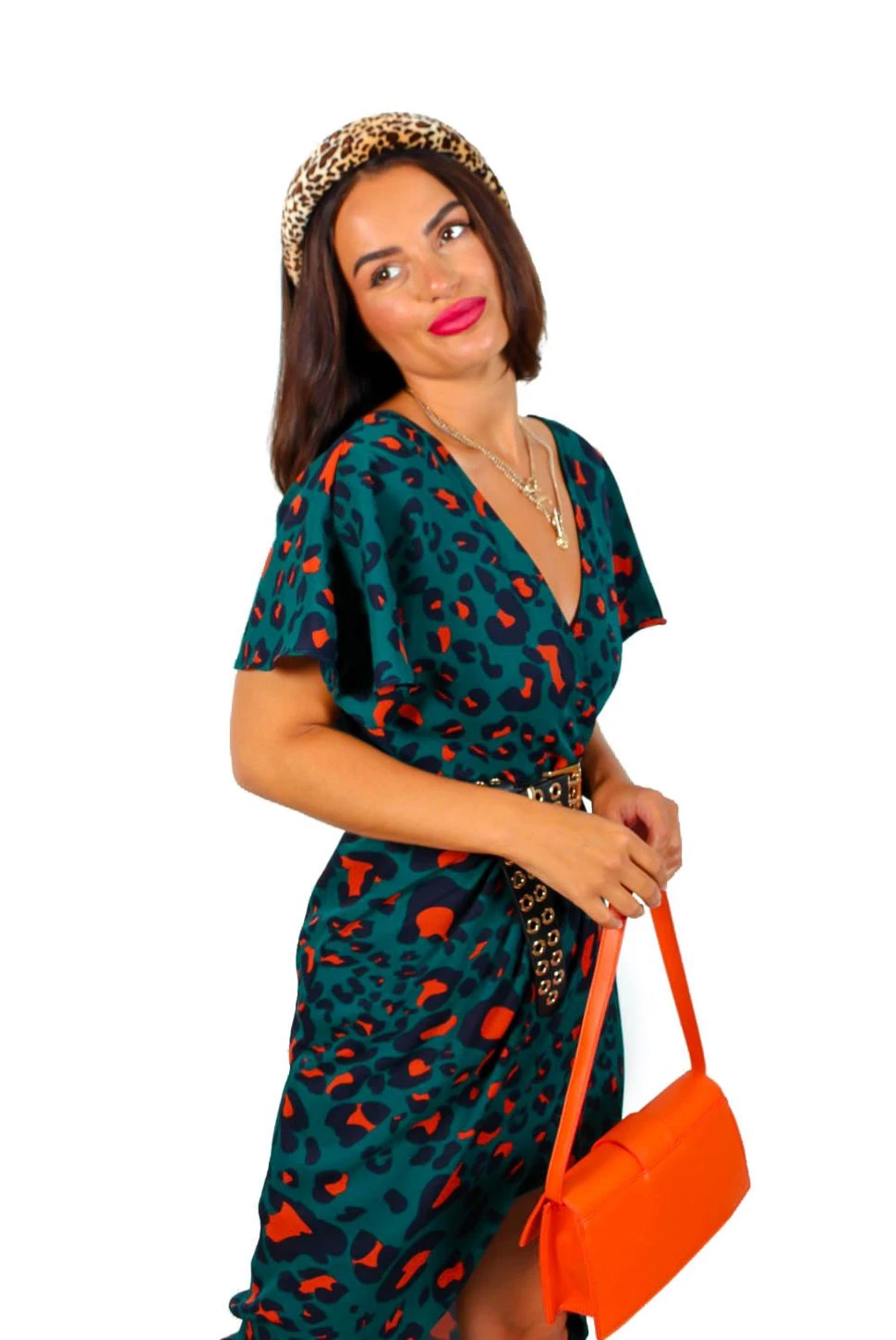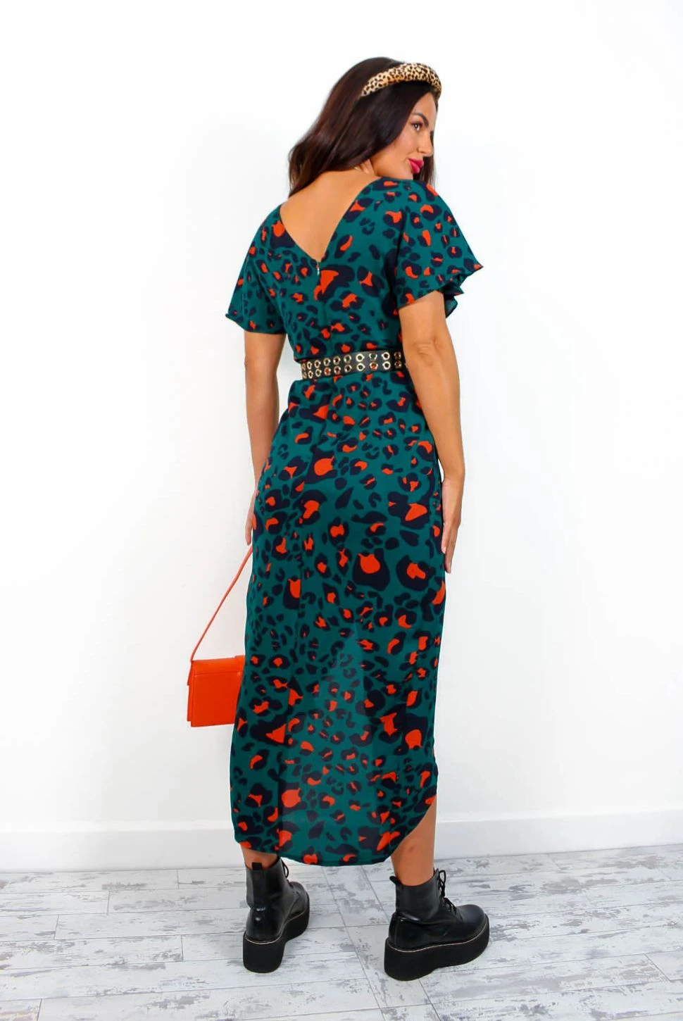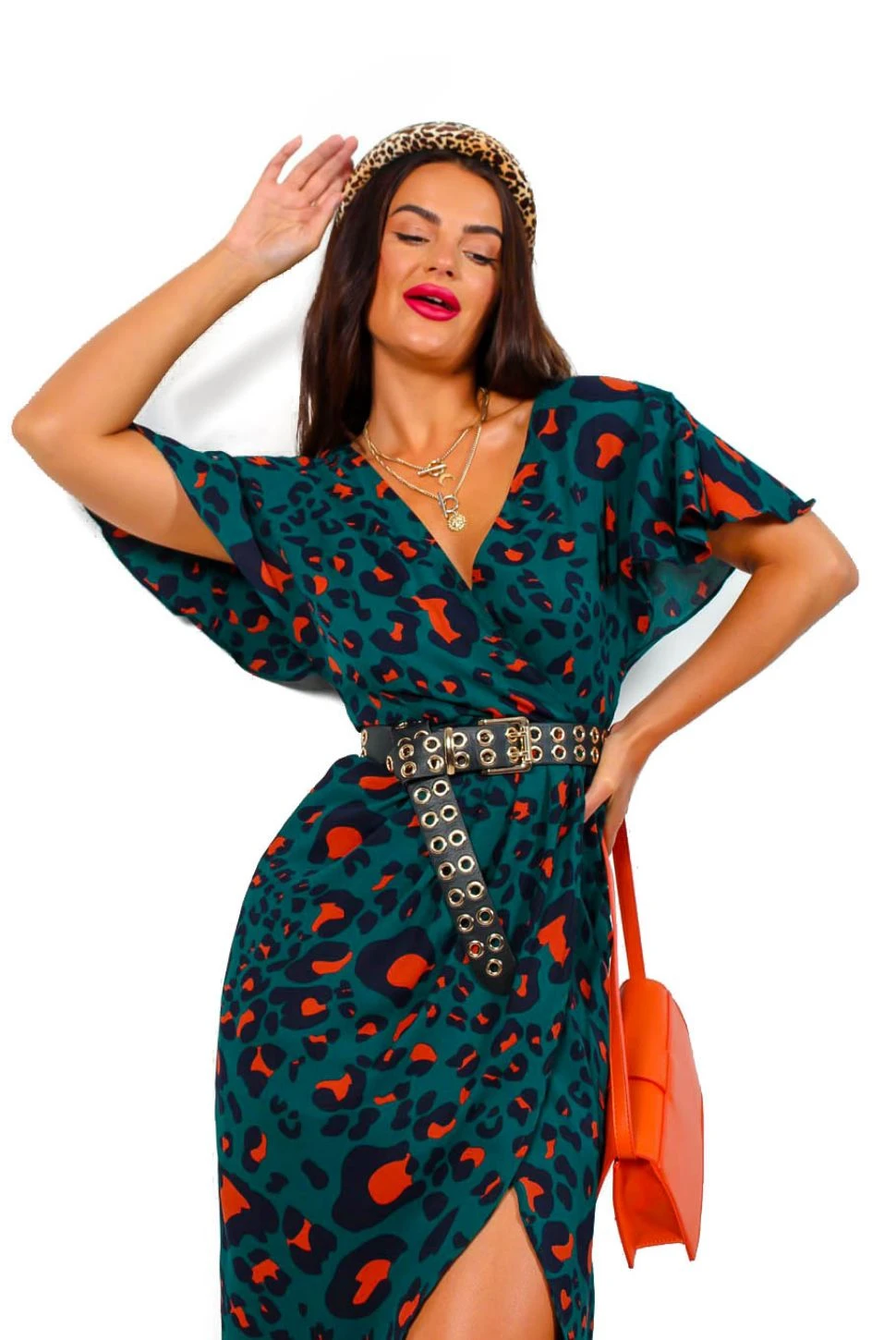 You know A/W season is here when the forest orange leopard comes out. This chic midi features a forest and orange leopard print, a wrap style neckline and silhouette, loose flowing short sleeves, and a front split that shows just the right amount of leg. Swap out those chunky boots for killer heels to take this dress from day time chic to night time sleek.