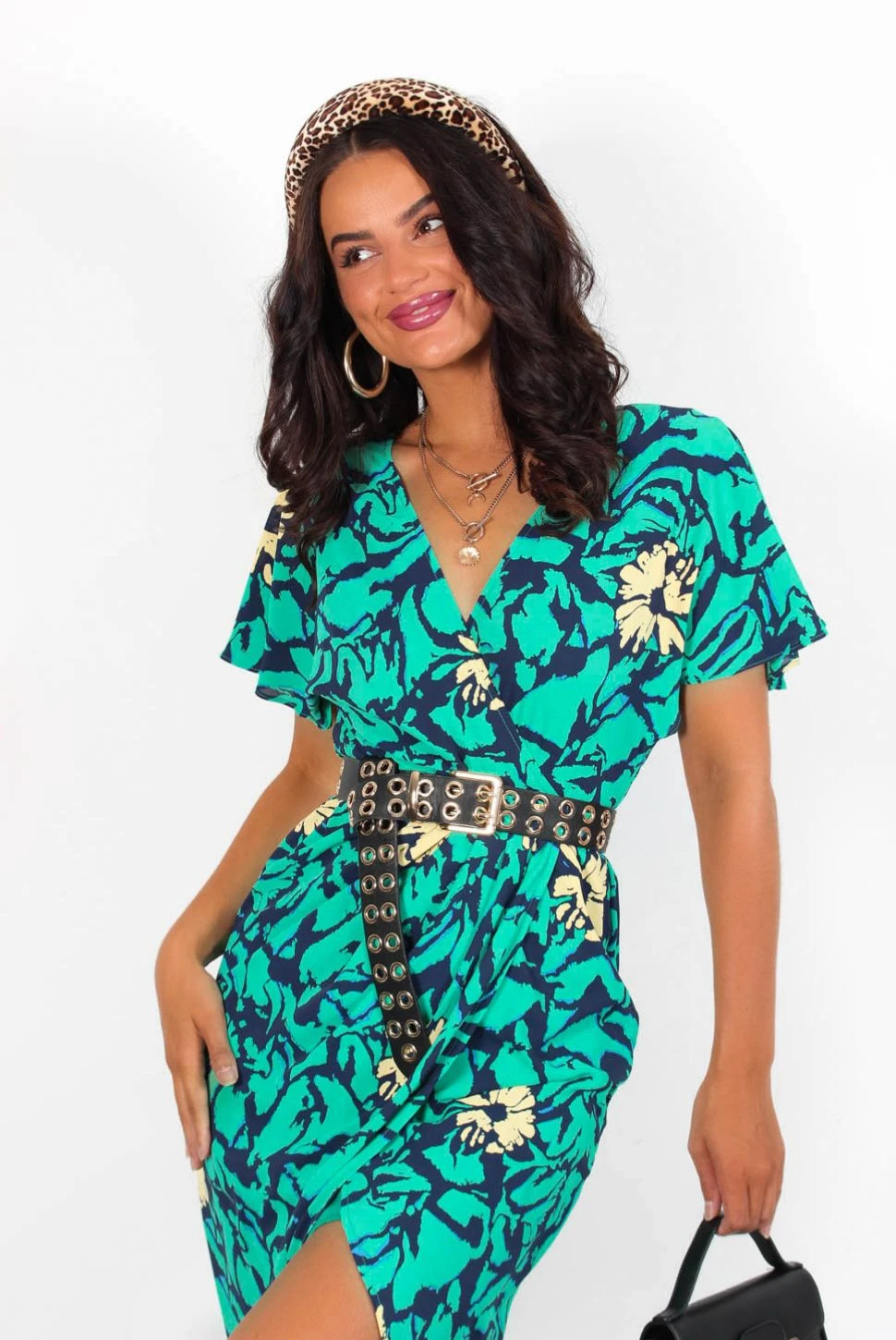 – Navy and sea green floral print with yellow accents