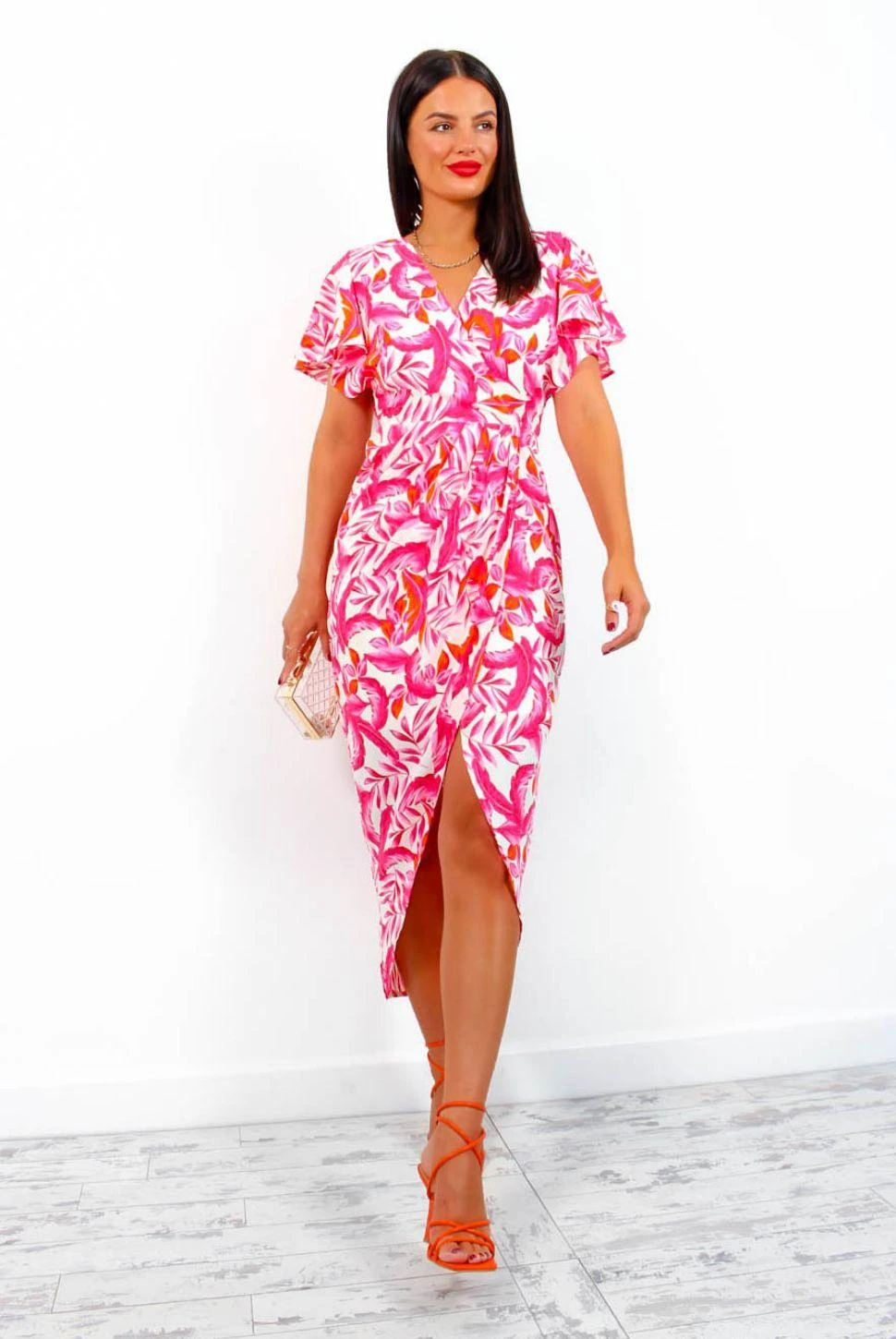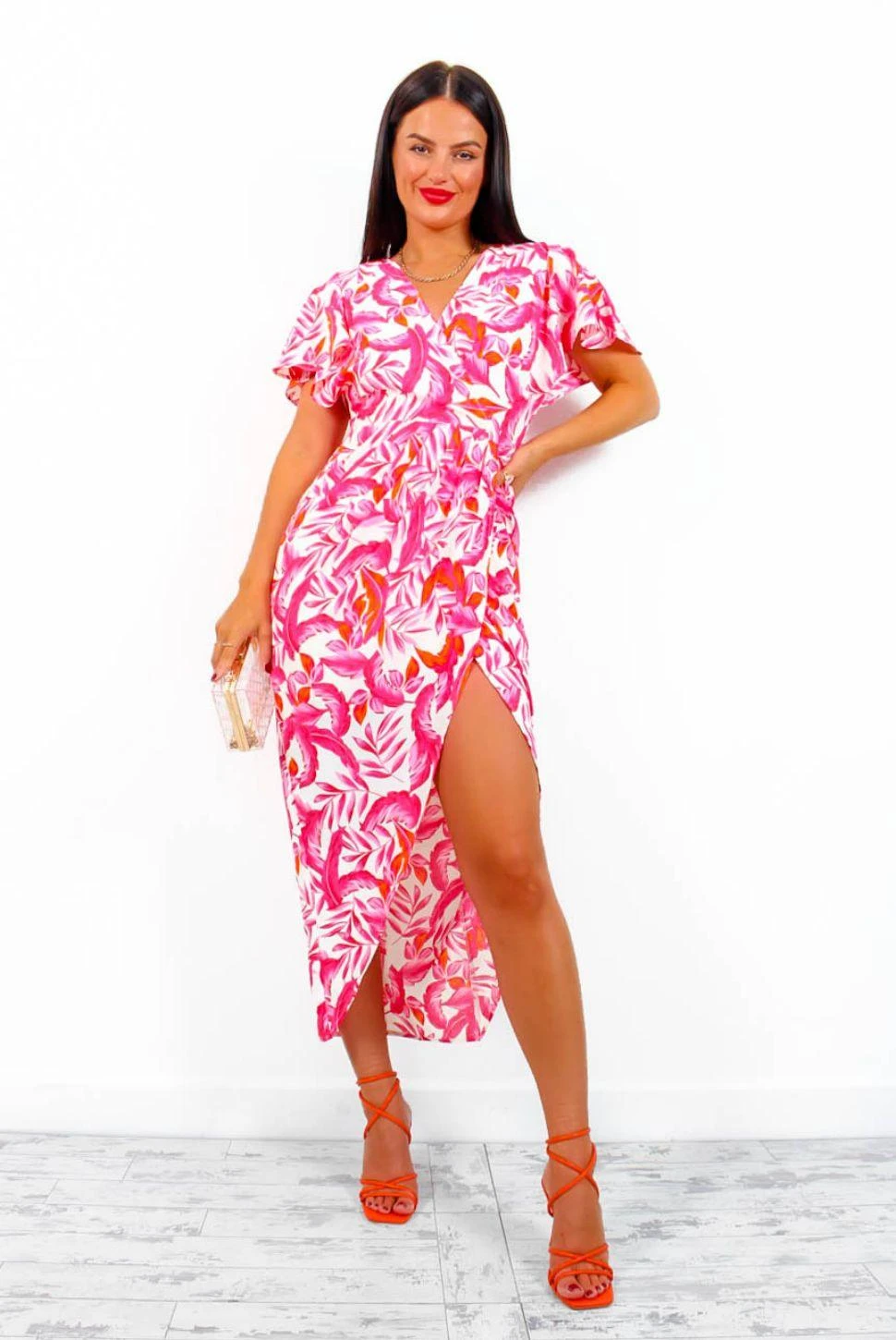 I totally adore you babe! This chic flattering midi features a pink and orange tropical print, a wrap style neckline and silhouette, loose flowing short sleeves, and a front split that shows just the right amount of leg. Pick your fave colour in the print and match your accessories for a head turning wedding guest look.Â