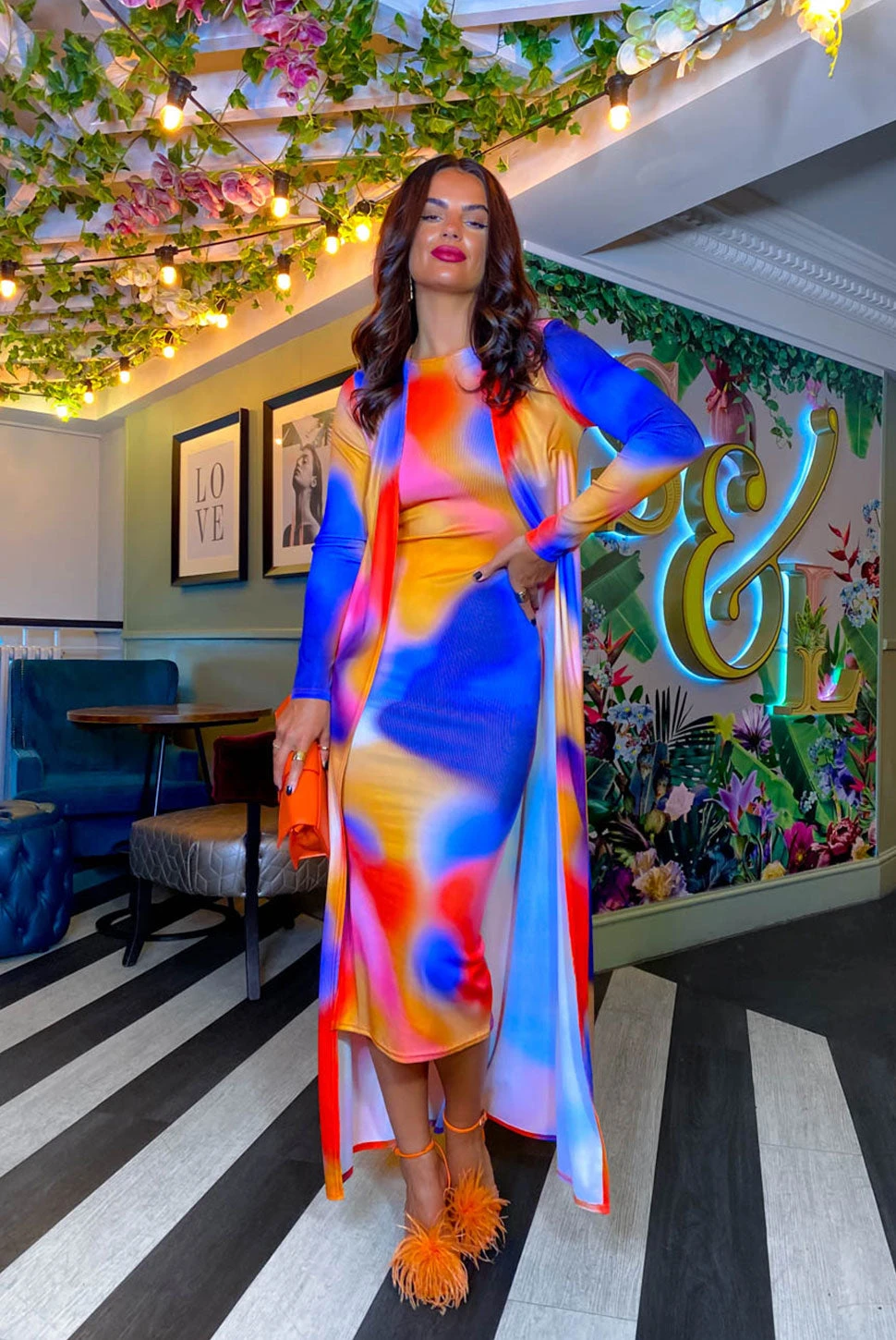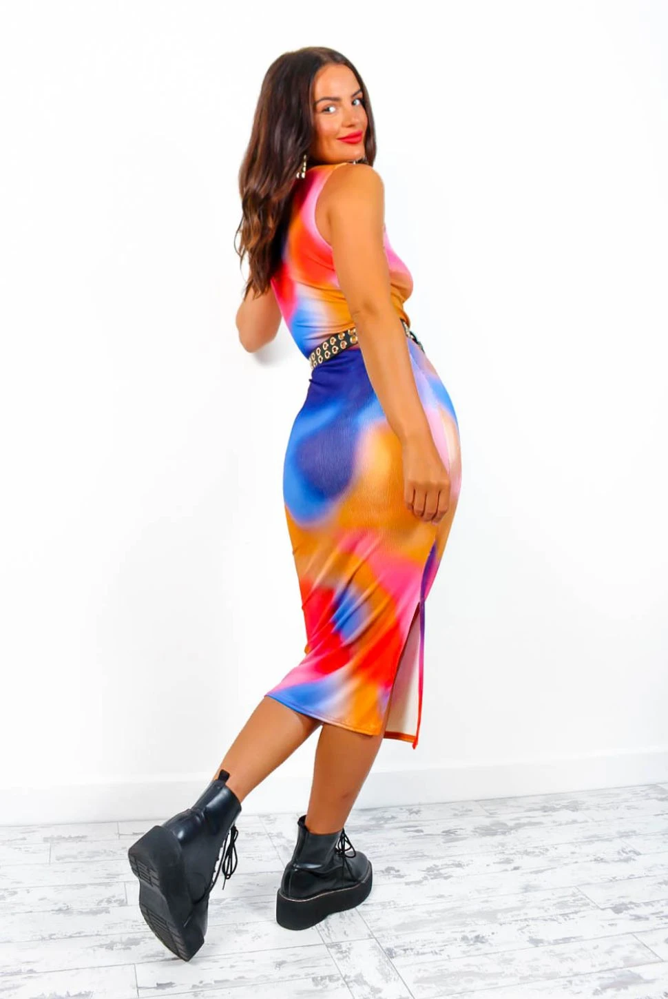 All the fun happens when the sun goes down… This stunning midi comes in a ribbed fabric, with a rounded neckline, sleeveless design, side split, and in that beautiful sunset colourway its a wardrobe need. Style with the matching cardigan, blue heels and a blue bag for a night out look with serious 90s rave vibes.Â