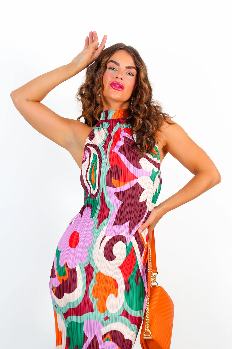You look incredible, Doll, that’s all that matters. Stun in our All That Matters maxi dress! With its fitted plisse material and abstract floral print, it has a super comfortable stretch fit all while showing off your glowing skin in a daring halter neck design. Dress it down for festival vibes with chunky boots and a fedora. Let your ‘fit do the talking and get ready to slay all day!