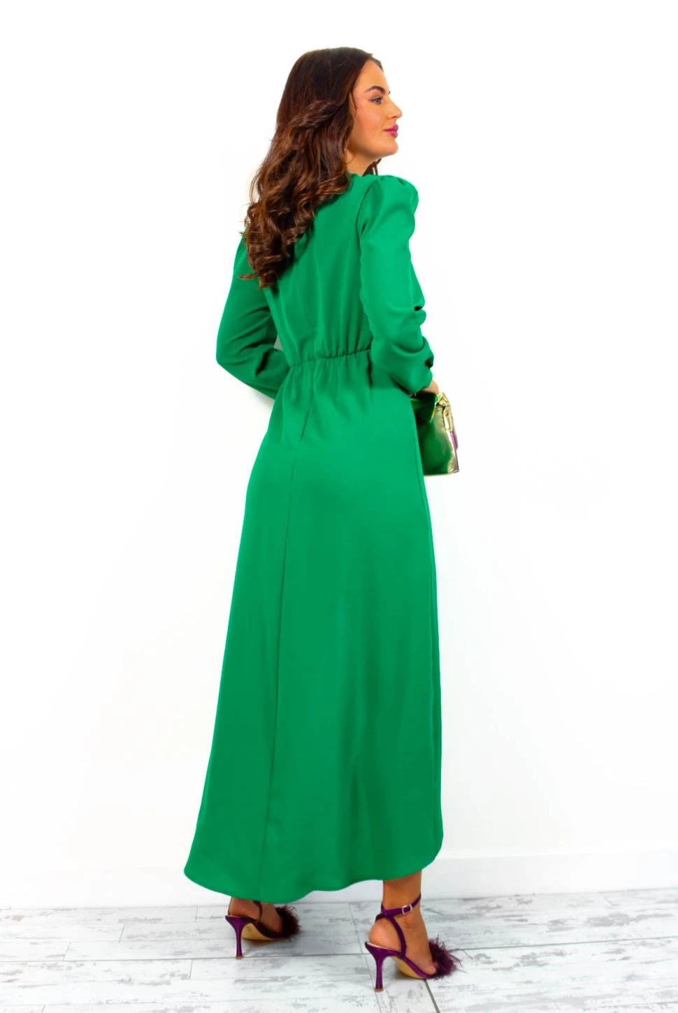 Doll, you’re our all time favourite! In a midi length but long and flowing to your ankles from the back, this forest green dress boasts a stunning twist detail at the waistline creating a flattering and figure enhancing fit. Featuring long cuffed sleeves, a plunged neckline and a wrap over style skirt which shows some leg. Pair with gold heels for a gorgeously glowing seasonal look for that winter wedding you’re attending.