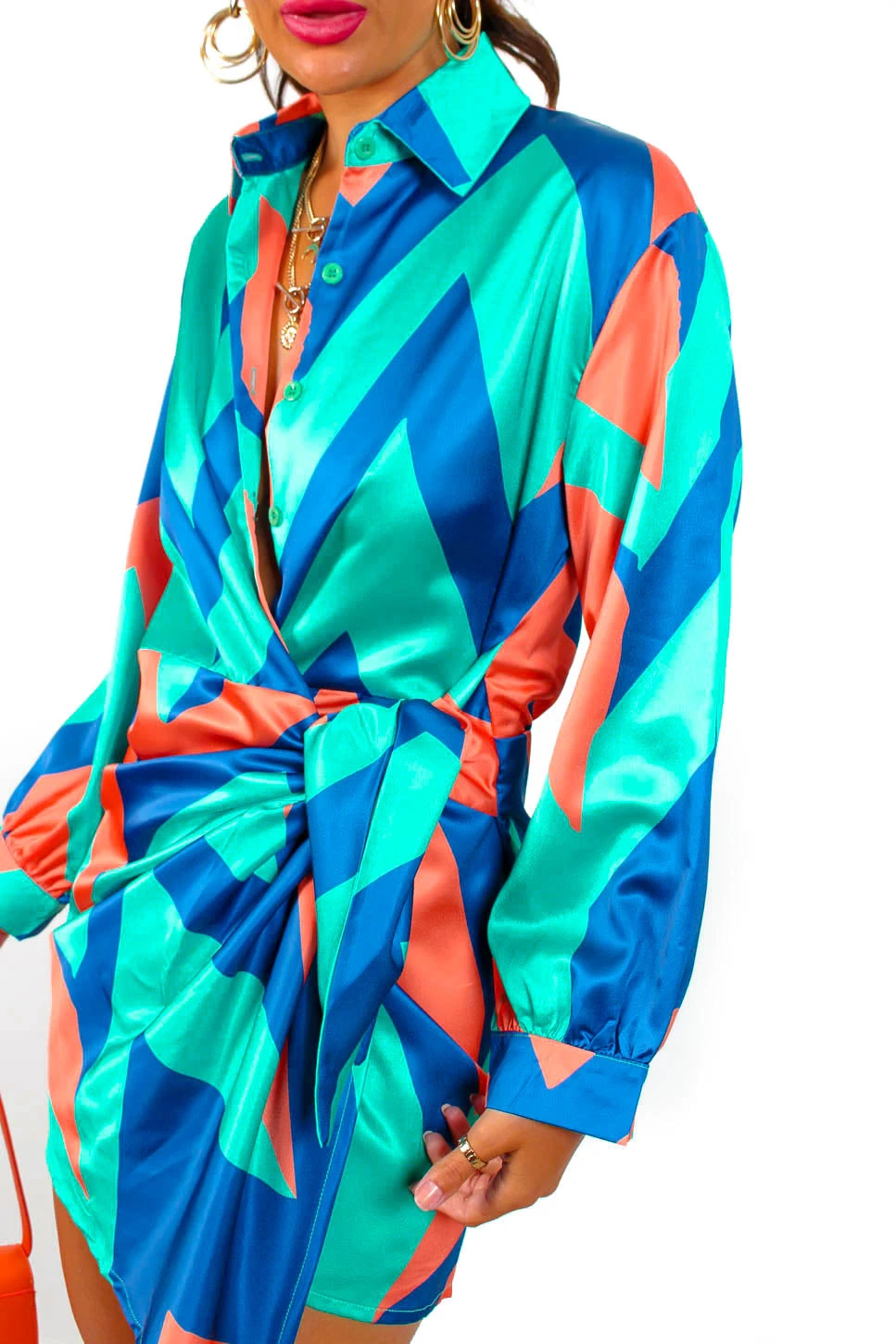 The ultimate IT girl. This geometric print mini features a satin style fabric, collared neckline, button-down fastening to the waist, wrap-style fastening on the skirt, and cuffed long sleeves. Dress down with some in style chunky boots, an oversized coat, and a cute day bag, to nail this years sought after autumn look.