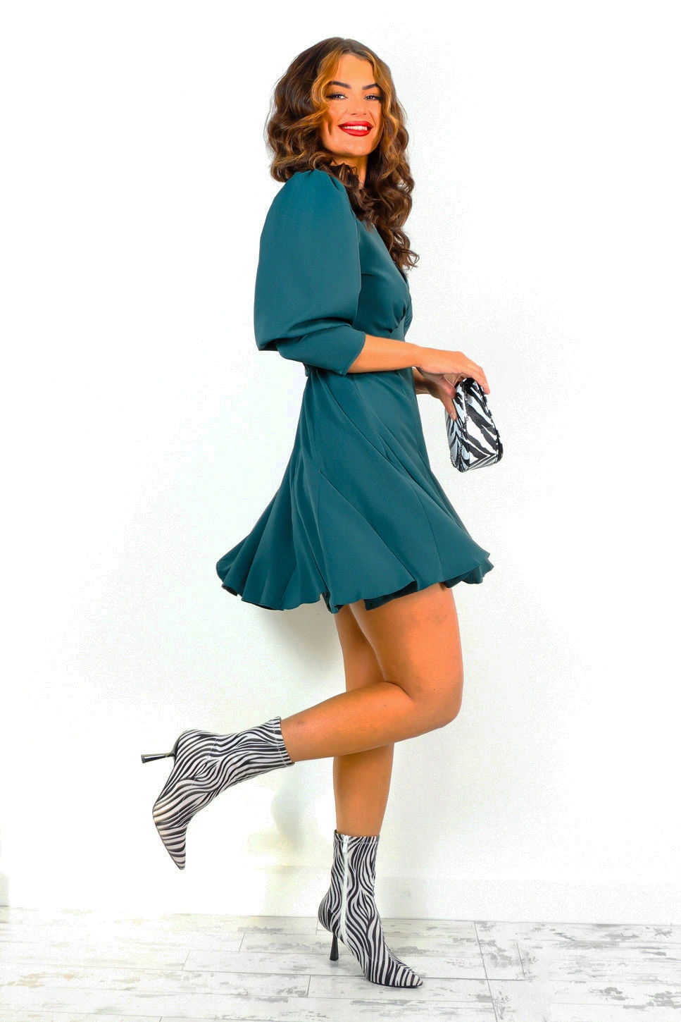 Category is cute mini dresses! With a swishy pleated skater skirt and fitted bodice, this forest green mini dress is the perfect addition to your wardrobe. Looks super classy with black stilettos, fine gold jewellery and a popping red lip.