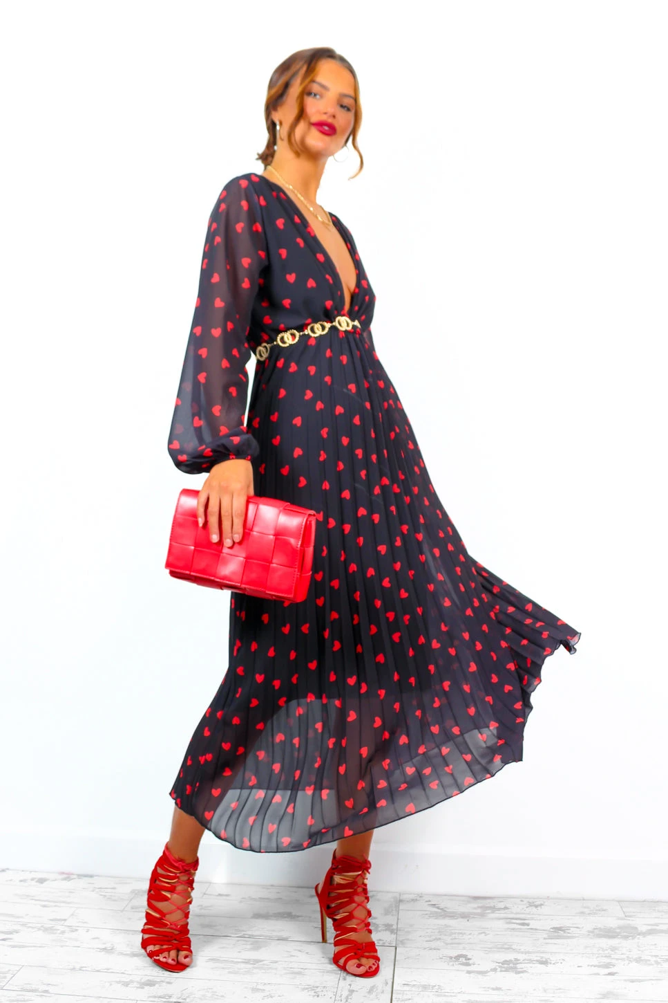 Head over heels, deeply and crazily in love with this dress! You’re sure to win their heart in this stunning pleated midi dress. With a crossover neckline that can be plunged, and romantic red hearts peppered across a floaty sheer black overlay – it’s hard to resist this, Doll! Add a matching red lip for a look that won’t go unnoticed.