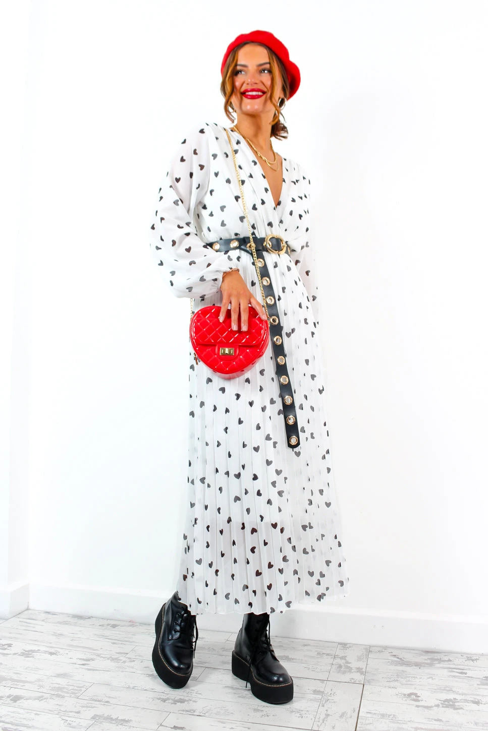 Sooo… I followed my heart and it led me to this dress! Whisk up a whirlwind romance in this stunning black and white print dress. With a crossover neckline that can be styled plunged, and a super cute black hearts pattern peppered across a floaty white sheer fabric – how could you not fall in love, Doll! Jazz things up with a juicy red lip and bag combo for a look that’ll leave ’em all heart-eyed.