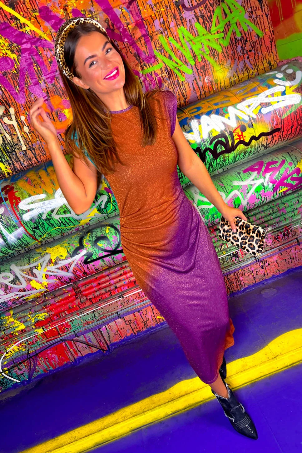 Every Doll wears a little sparkle, some in their dress and some in their eyes. Sometimes both! Social butterflies, it’s time to make an entrance in this dazzling midi dress. Complete with a kick split and shoulder pads, this purple to rust to teal ombre dress will have heads turning as you shimmer by to the bar with its glittering lurex detail and flattering side ruching. Pair with your fave cocktail and your fave heels for nights out with your besties.Â