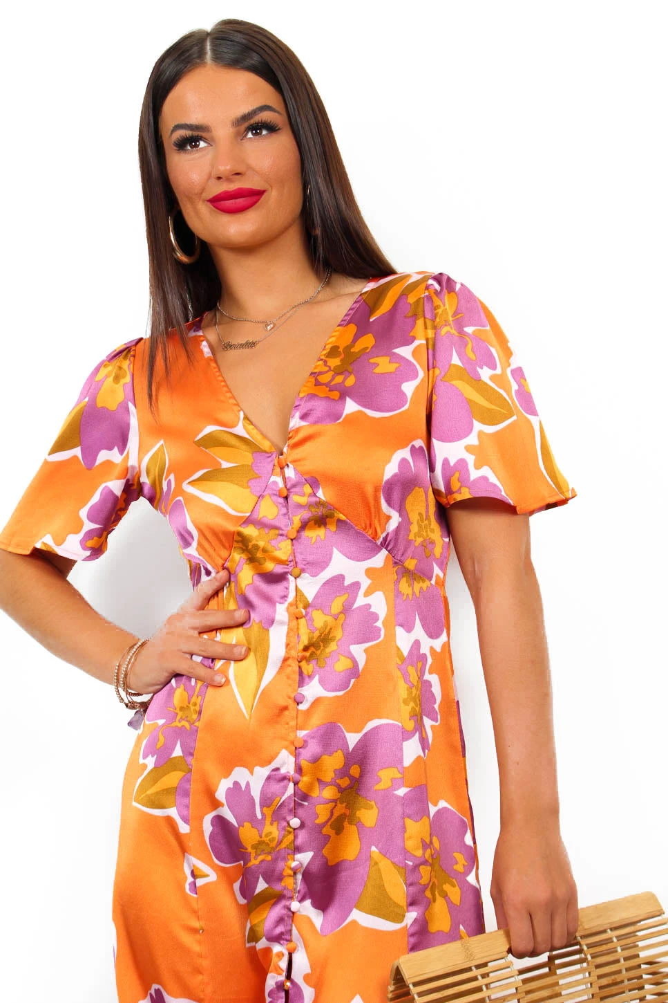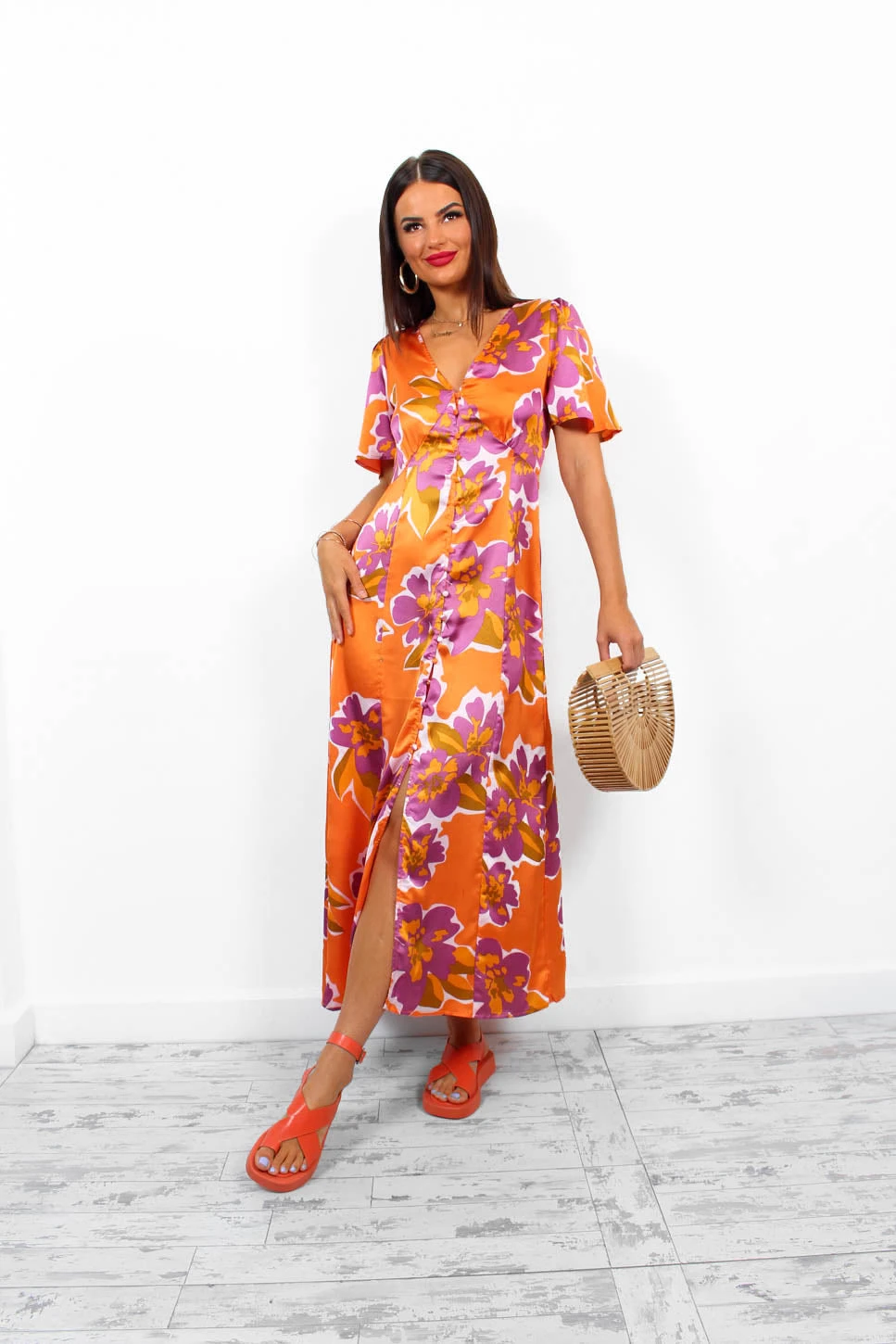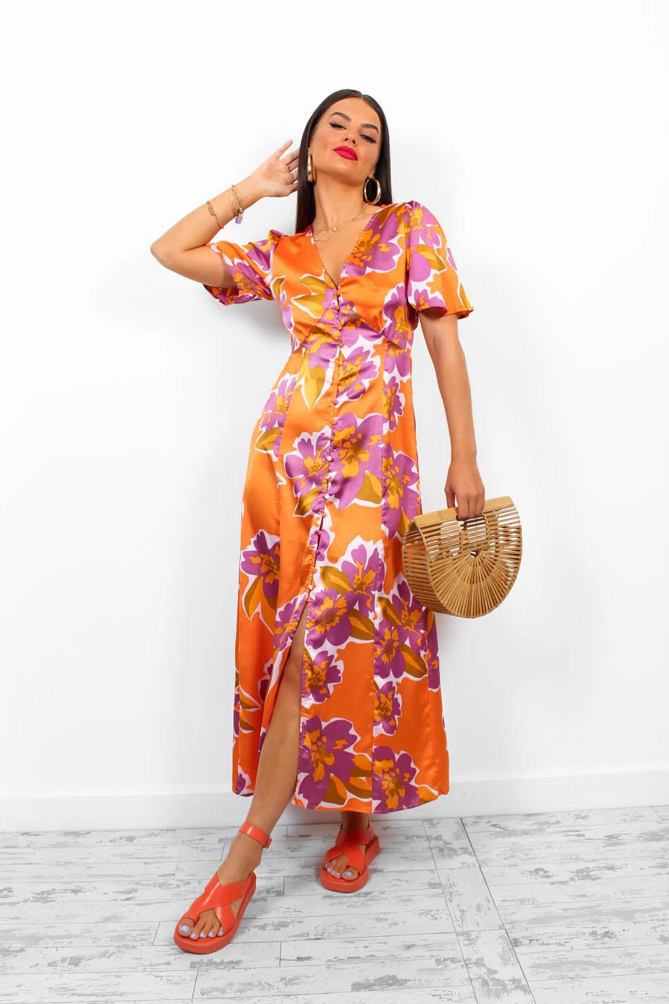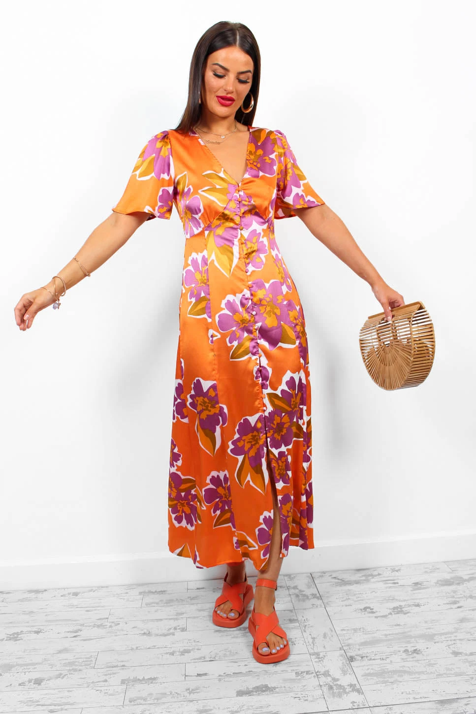For the babes who brunch. We’re always obsessed with a tea dress and this stunning midi features a satin style fabric with an orange base and purple floral design, a v-neckline with button down fastening, and short floating sleeves. Go gold on the accessories for a look perfect for a garden style wedding.