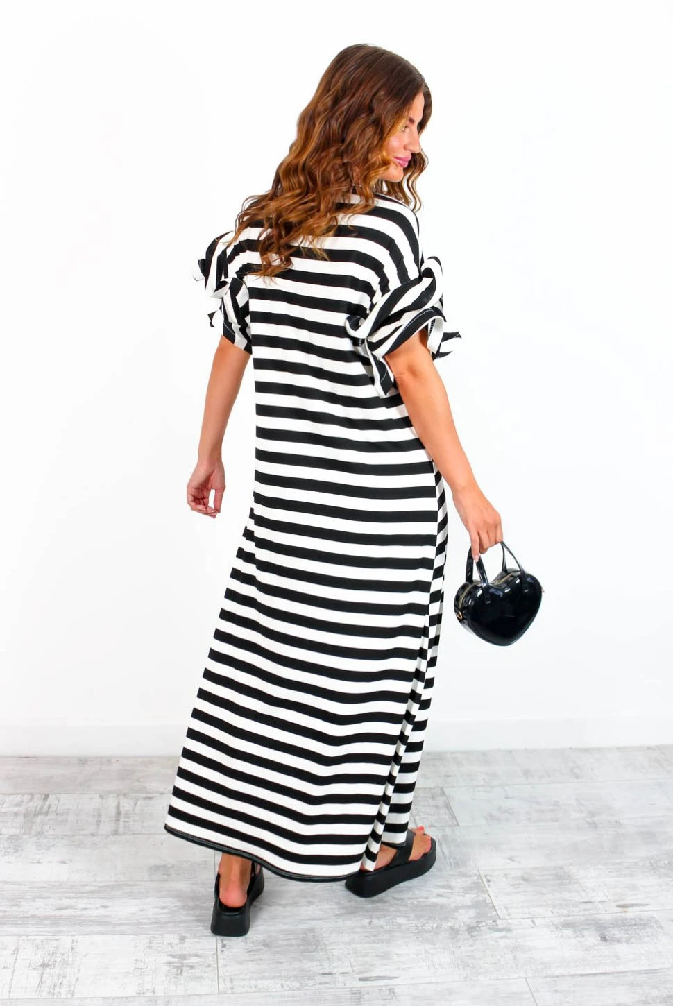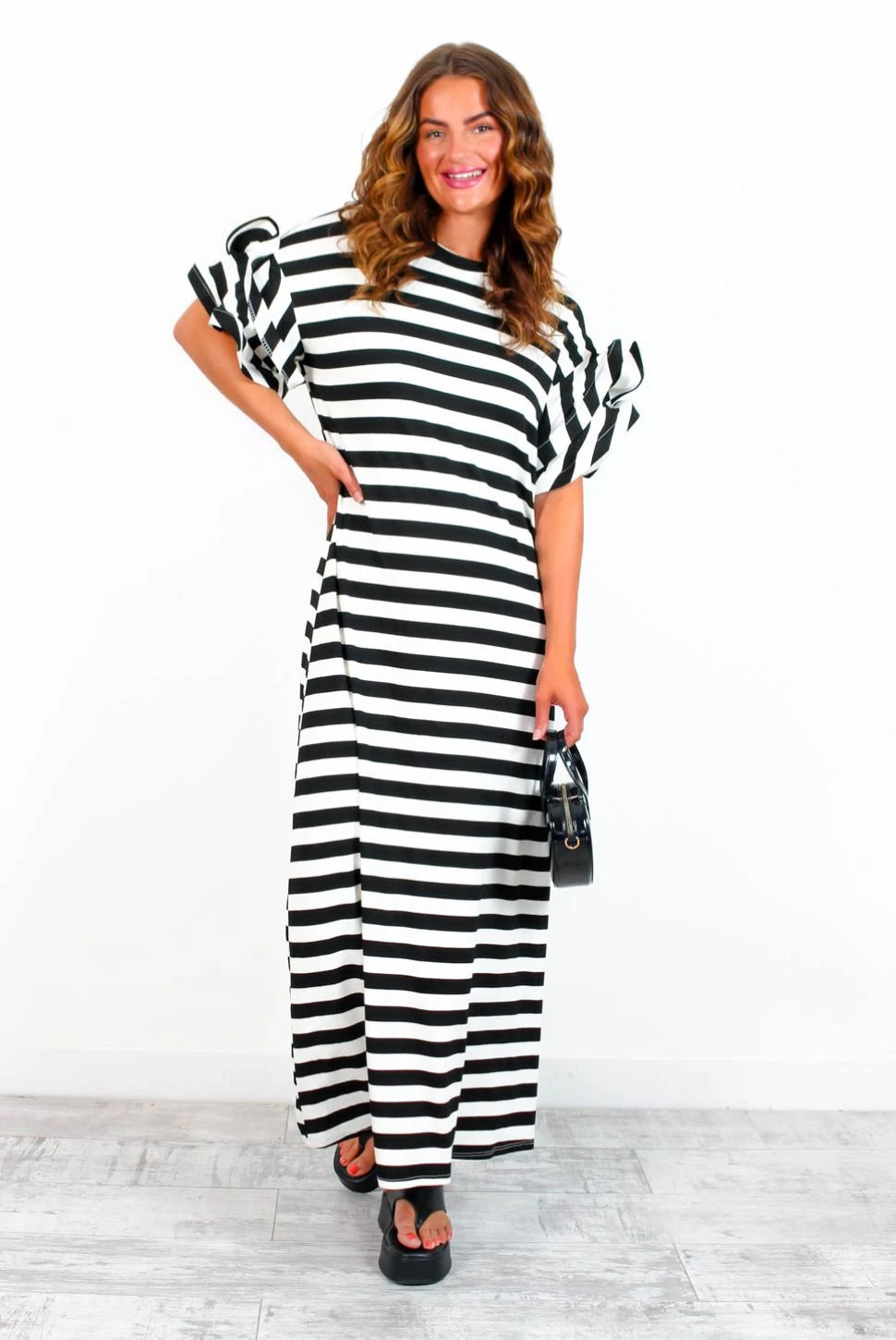 Feelin’ fine! Take off-duty to the next level in this monochrome maxi dress. With a comfortable stretch material, boasting flouncy ruffled sleeves and a sleek black and white stripe pattern, this day dress is sure to make a statement! Slip on with chunky boots and a bold lip for an effortless but utterly fabulous day-to-day look. Casual never looked so good, Doll.