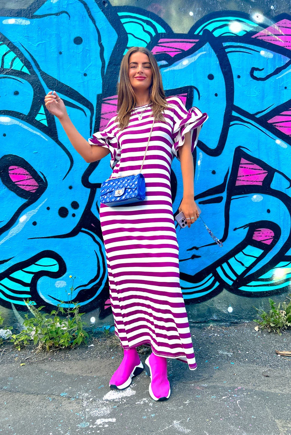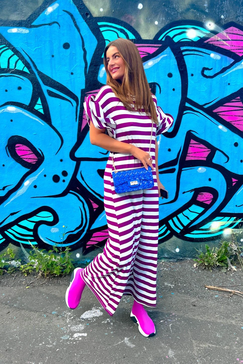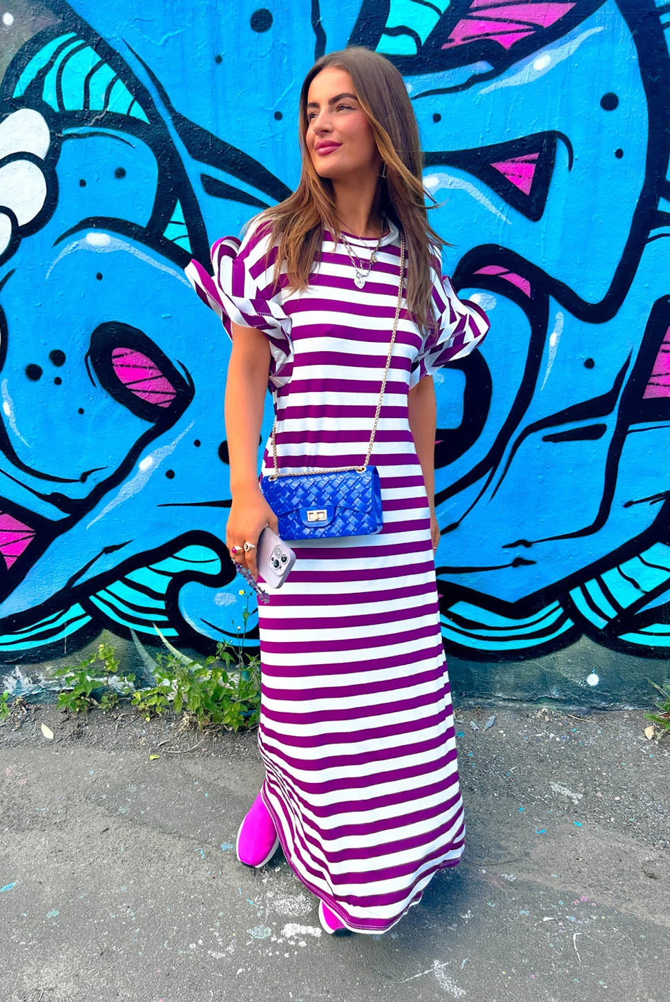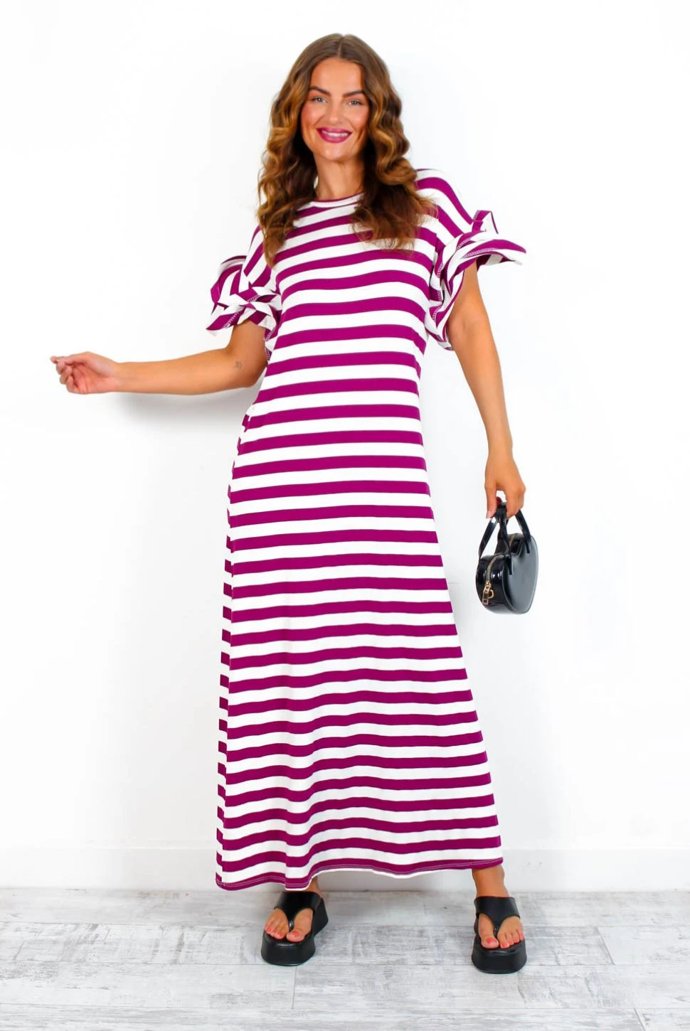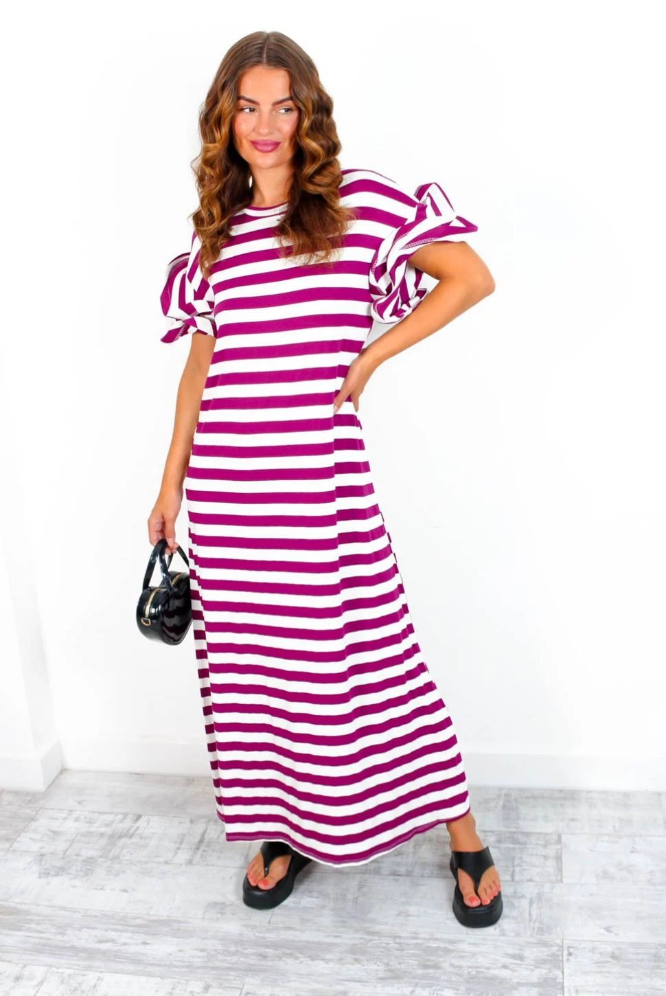 Feelin’ ourselves! Take off-duty to the next level in this maxi dress. With a comfortable stretch material, boasting flouncy ruffled sleeves and a sleek magenta and white stripe pattern, this day dress is sure to make a statement! Slip on with chunky boots and a matching magenta lip for an effortless but utterly fabulous day-to-day look. Casual never looked so good, Doll.