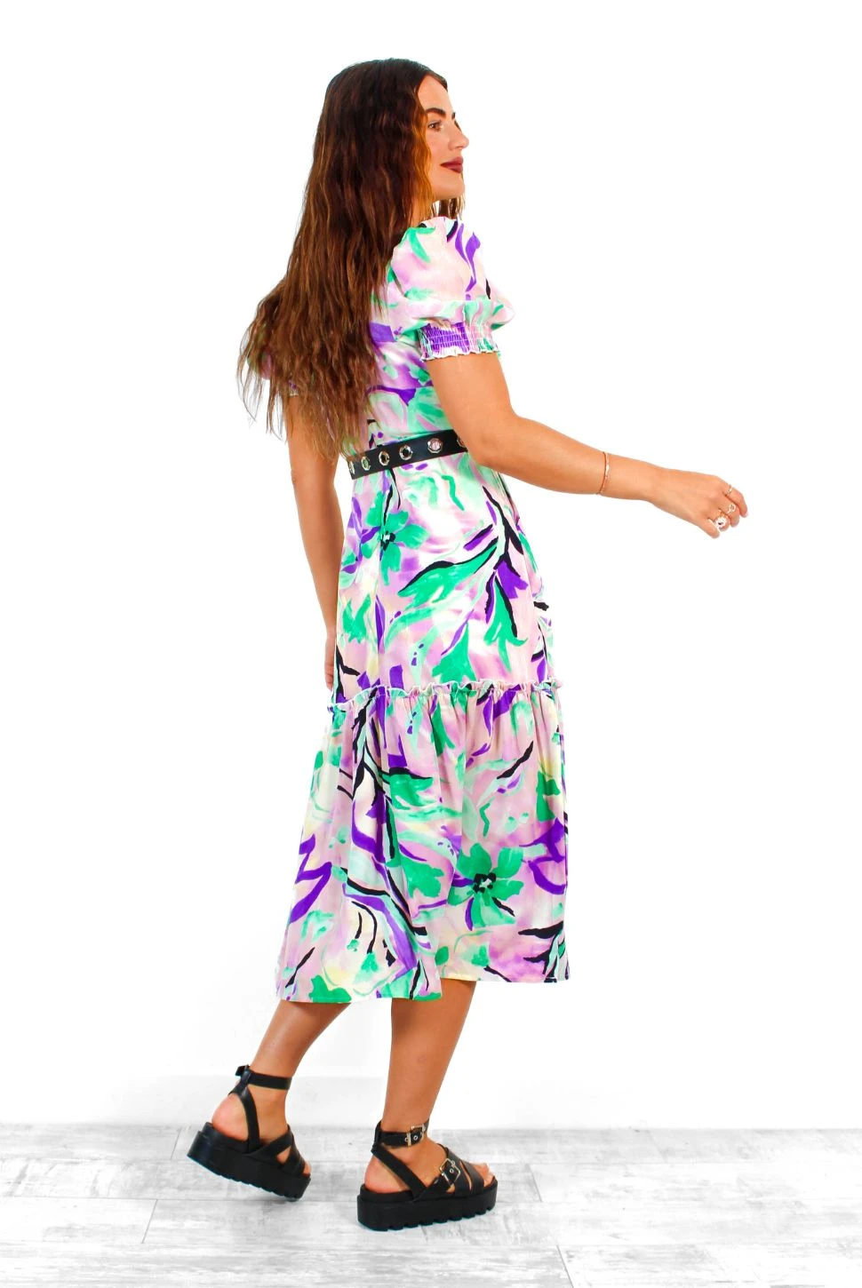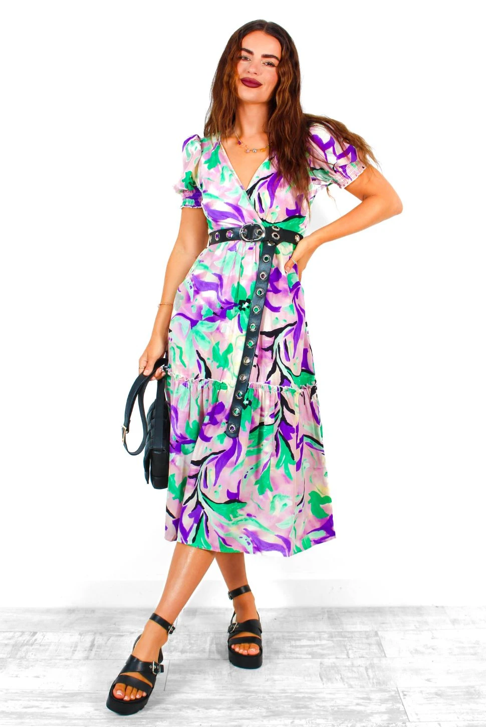 Go get it swirl! This midi dress comes in an array of purple and green abstract swirl print, with a cross-over neckline, short elasticated sleeves, and a tiered bottom. Perfectly paired with wedges and a cute clutch and you’re garden party ready.