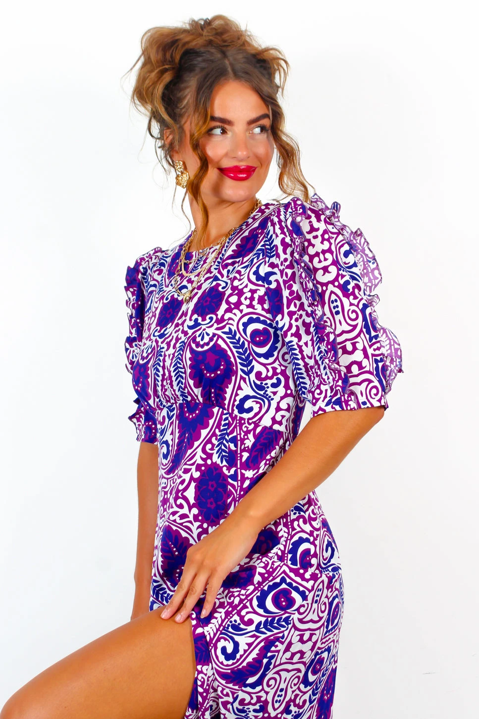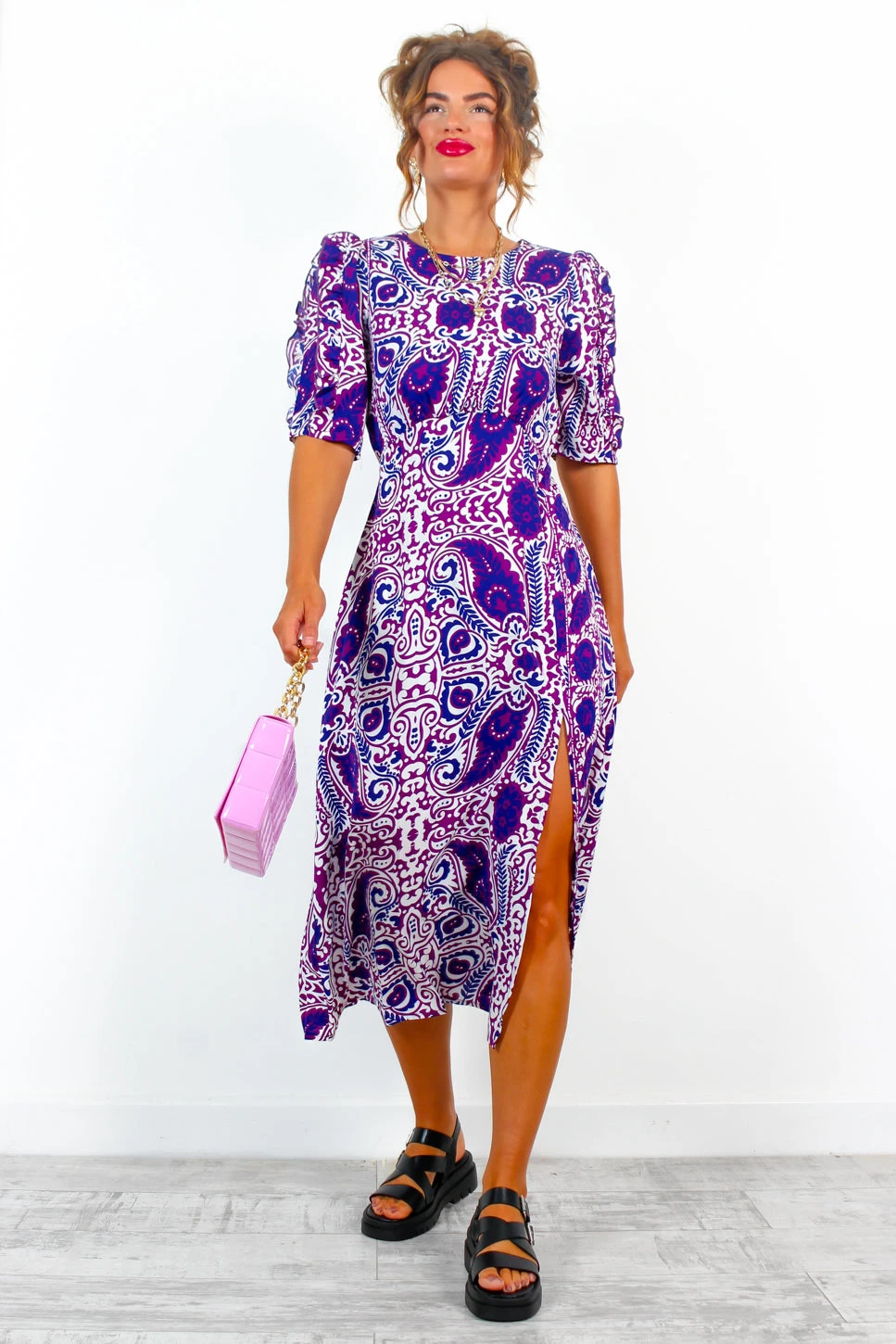 If looking this good is a crime, cuff me up! Paisley never goes out of style, and this purple patterned midi is giving us all the sunny carefree vibes. In all-over paisley print with a stylish round neckline, shirred puff sleeves and sassy side leg split – this is the silhouette for showing off your wild style! Go for gold with the jewellery and add in pink colour pop accessories for a fun and fabulous look at drinks with the Dolls!