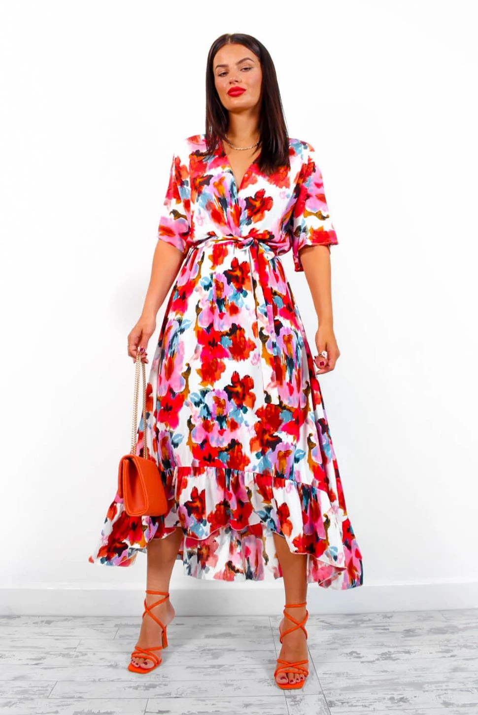 Live your dolce vita life! A classic style, with a romantic floral print blooming throughout, it’s not hard to see why this is a DLSB Doll favourite! In a midi-maxi length, this gorgeous dress features batwing sleeves, a high-low flowing frilled hem and a tie belt to cinch and shape the silhouette. Add a gold chain belt and matching heels for all those fancy events with plenty of wine!