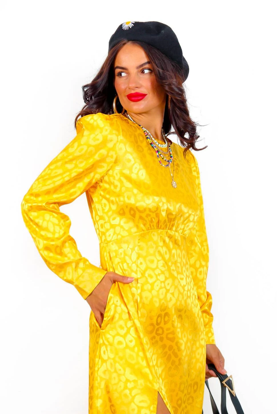 Look glam for glam plans! It’s officially sunny season, Doll, so turn up the brightness in this vibrant mustard yellow midi dress. Draped head-to-toe in one of our favourite fabrics (a slinky jacquard leopard print in gorg mustard) finished with long sleeves, a round neck and a sassy double leg split for a little drama. Chuck on chunky boots for days at those low-key pub drinks, or give it some glam in metallic gold heels and statement jewellery.