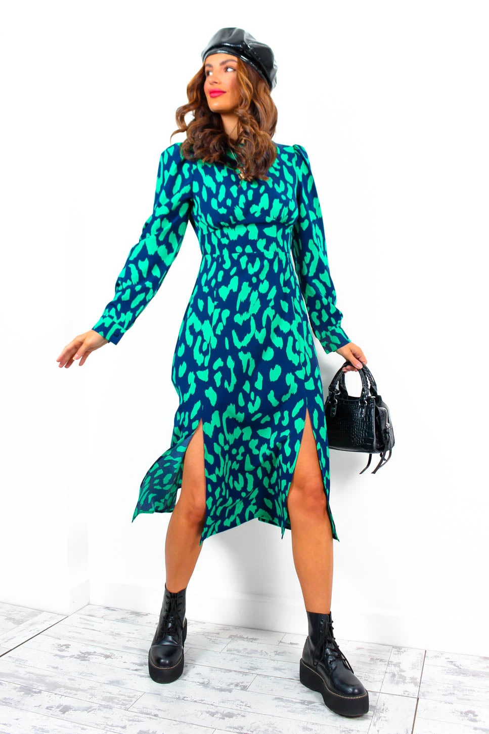Wild thing, you make my heart sing! – Us @ this dress. In a new navy and green leopard print, this most-wanted midi dress is the pawfect piece to take your transitional dressing into wild new territory. Complete with long cuffed sleeves and a daring double leg split to show just the right amount of leg, just add gorg green heels for wild nights out or a chunky black boots for a bold daywear look.