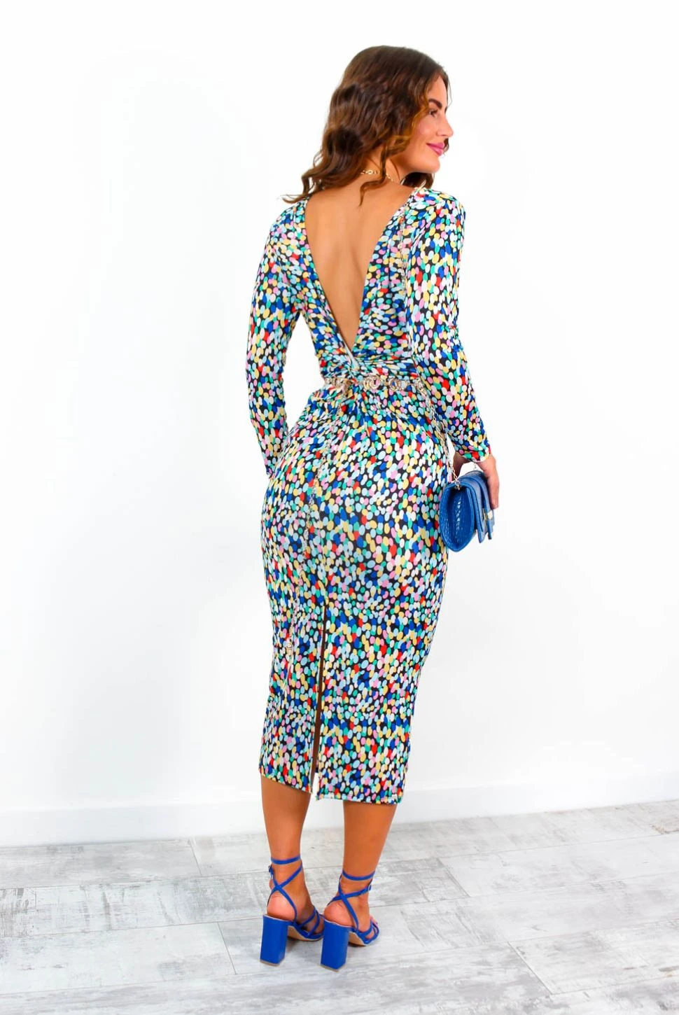 Don’t wait for the perfect moment, just take the plunge and make it perfect! In a figure hugging bodycon fit with modest long sleeves that balance out that gorgeously daring plunged neckline – any moment is perfect in this head turner! In a midi length, this twist front dress is adorned in multi spot prints and we are obsessed. Be a bold goddess always in lashings of gold jewellery and a sultry red lip.