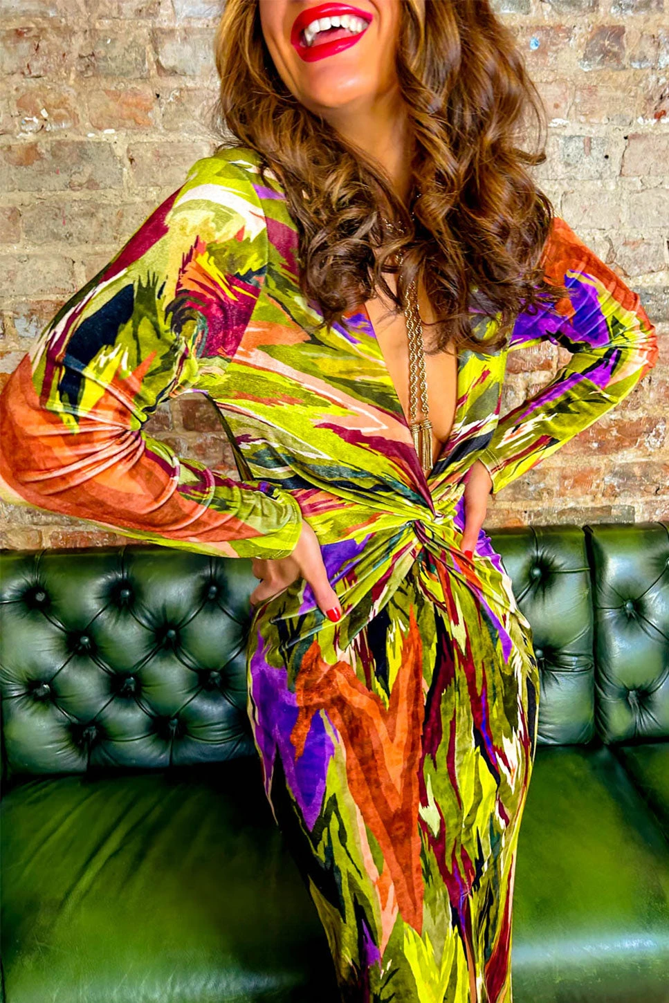 Don’t wait for the perfect moment, take the moment and make it perfect! With modest long sleeves, a daring plunged neckline complete with twist knot detail and a subtle front split, any moment is perfect in this head turner of a midi dress. Stay tonal with golden accessories or go for purples to make the abstract prints in the dress pop!