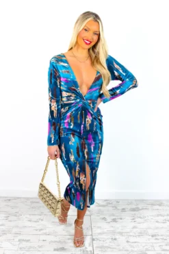 Dont Make Me Wait – Blue Purple Abstract Print Plunge Midi Dress