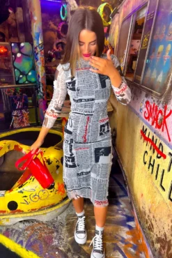 Utterly Obsessed – Black White Newspaper Print Mesh Midi Dress