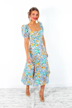 If it’s not florals, we don’t want it! In a midi length, this occasion wear stunner features a flattering bardot style top with straps, a wrap style skirt with a modest split, and complete with delicate blush florals on a black base. The perfect dress for that wedding you RSVP’d to, pair with matching blush pink accessories a classy look that is simply the epitome of elegance!