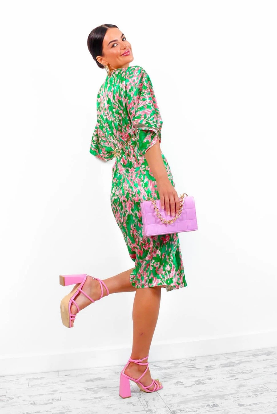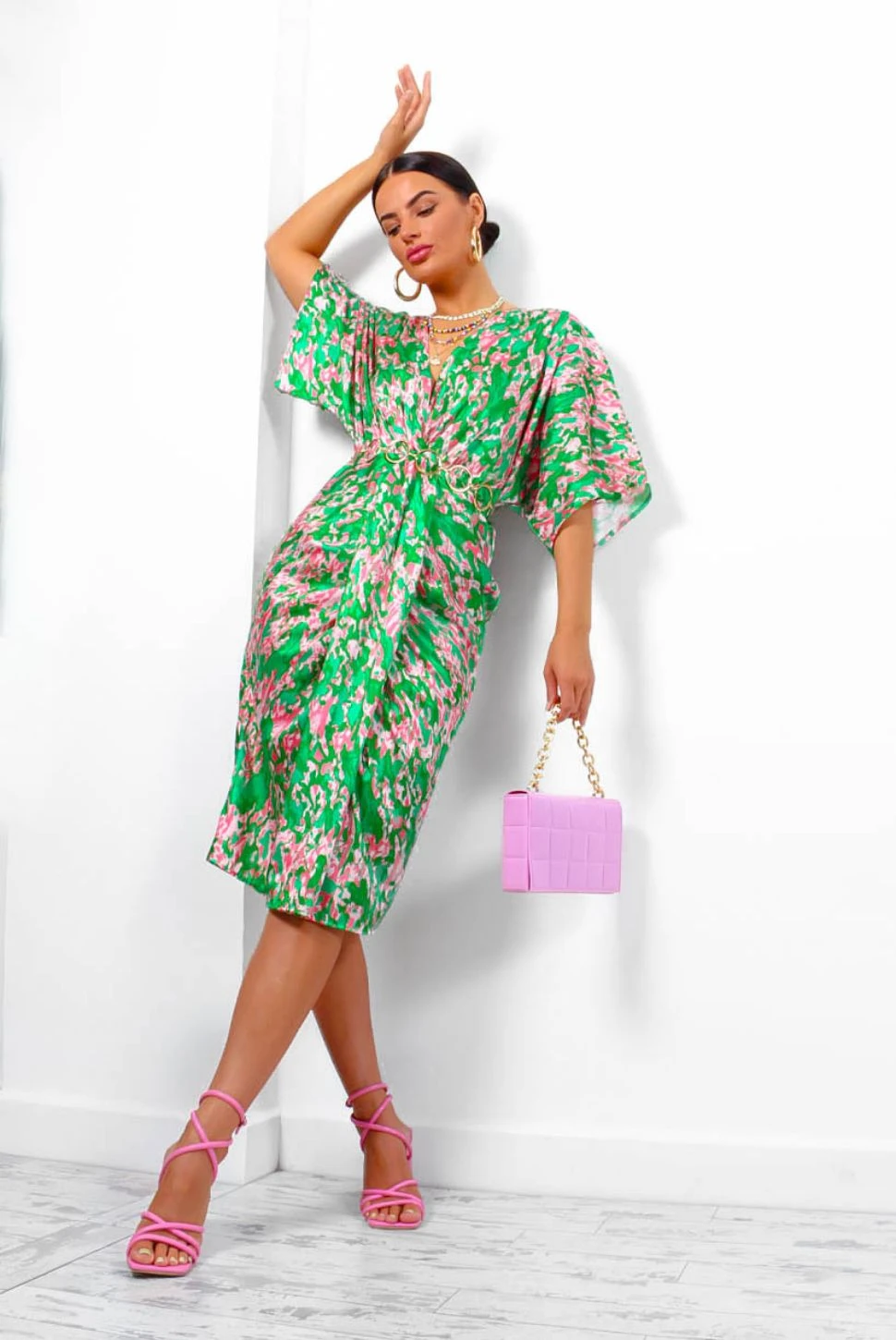 The dress you’ve been looking for… you’ve found it, Doll! With flowing batwing sleeves and a daring plunging crossover neckline, this green and pink abstract printed midi dress is sure to get those heads turning – it’s a satin dream! Complete with a subtle leg split and draping detail that totally flatters your figure. Look effortlessly glam on those holiday evenings at sunset drinks with a tousled up-do and your favourite sandals.
