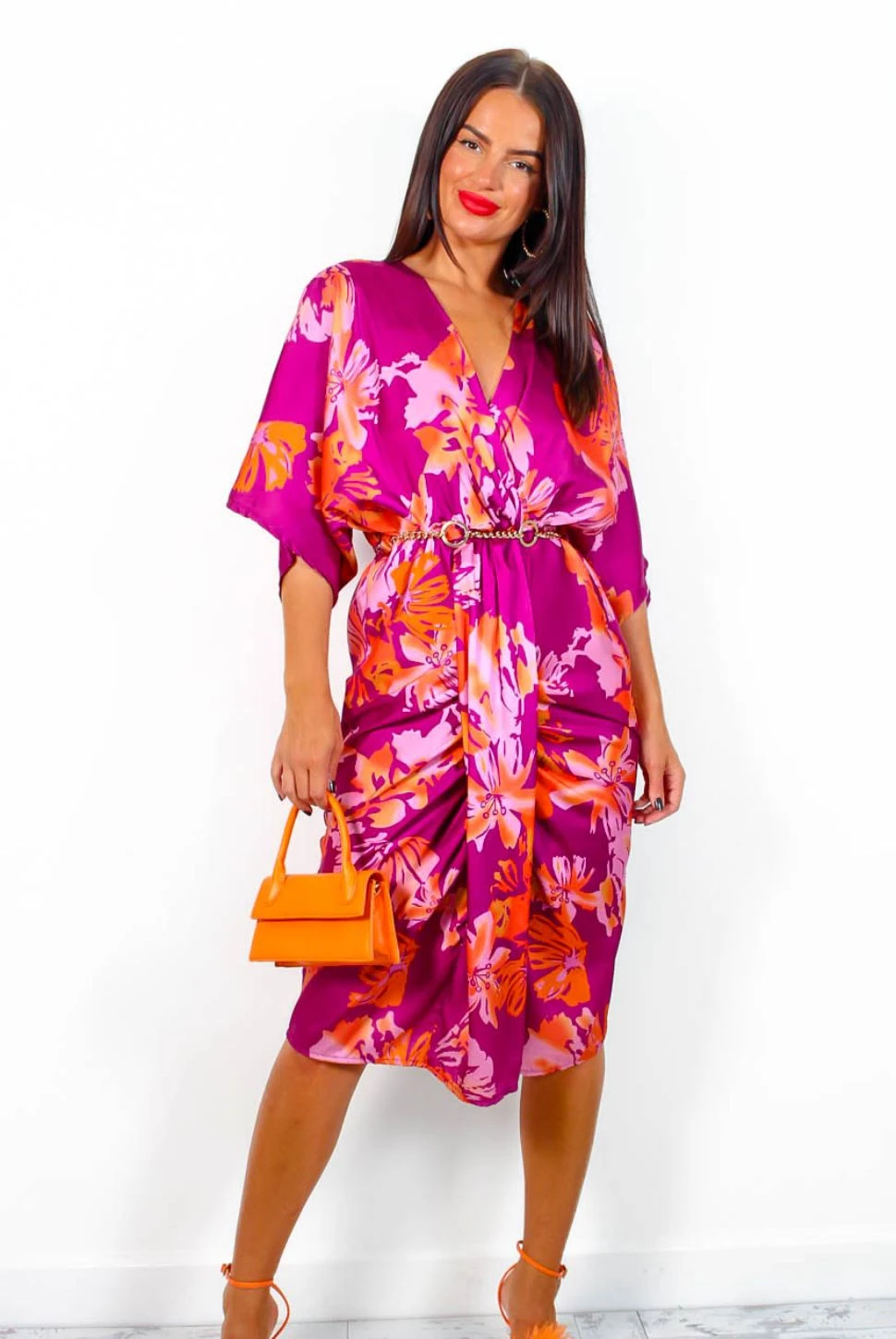 We’ve been looking for you! This midi features a magenta and orange print throughout, a v-neckline, short batwing style sleeves, an elasticated waist, middle ruching and front draped detailing. Compliment the print with orange feather heels, and a cute matching clutch for a killer look that is perfect for any daytime event.