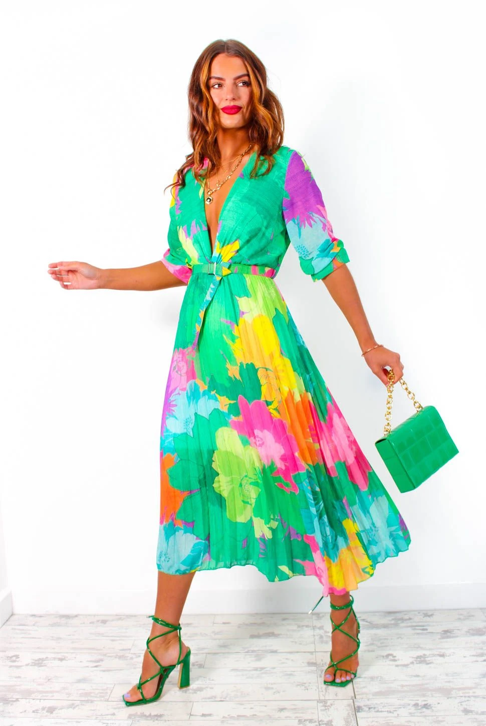 This look is blooming, and so will your confidence. This romantic midi dress features a green base fabric with an explosion of colourful flower print in yellow, orange, blue, and pink. Featuring a wrap style top, short elasticated frill sleeves, a pleated bottom, and matching material belt. Emphasise the accent colours with orange accessories for that dressy lunch date.Â