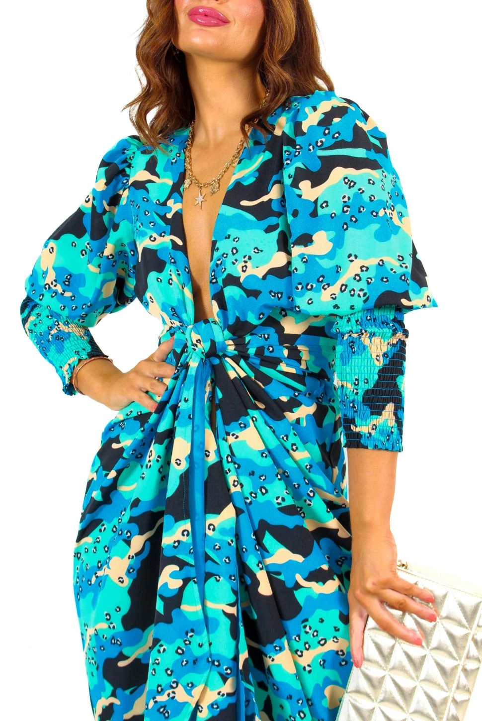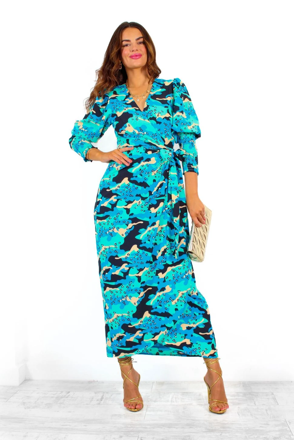Currently crushing on camo! Don’t blend in, Doll, stand out in this bold blue camouflage print midi wrap dress. A true fan fave with dramatic 3/4 length shirred sleeves, super versatile wrap waist and all-over camo style animal print in tonal turquoise and blue, it’s driving us wild! Keep it chic with strappy black heels, or go all-out with teal accessories to turn heads.