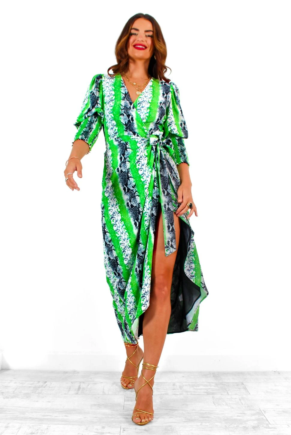Usually we’d say don’t be a snake, Doll, but this is the exception! Hiss those what-to-wear dilemmas goodbye with this fierce grey and green snake print midi wrap dress. A true fan fave with dramatic 3/4 length shirred sleeves, super versatile wrap waist and all-over snakeskin animal print in showstopping green stripe, it’s driving us wild! Go green for heels, red for lips, and turn up the texture with a faux croc bag.