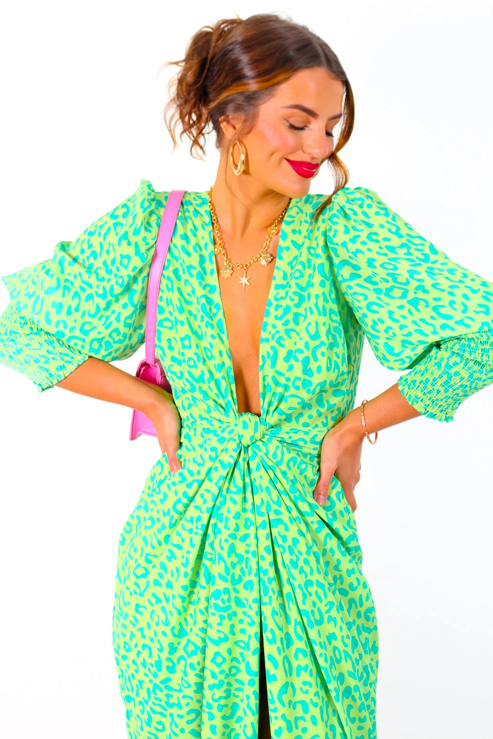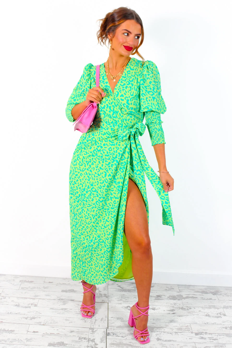 Wild hearts just can’t be tamed. Earn all of the fierce styling points in this bright and bold midi wrap dress. With dramatic 3/4 length shirred sleeves and roaring in zesty leopard print, this show stopper is driving us wild! Make a statement in refreshing yellow accessories for those Spring weddings.