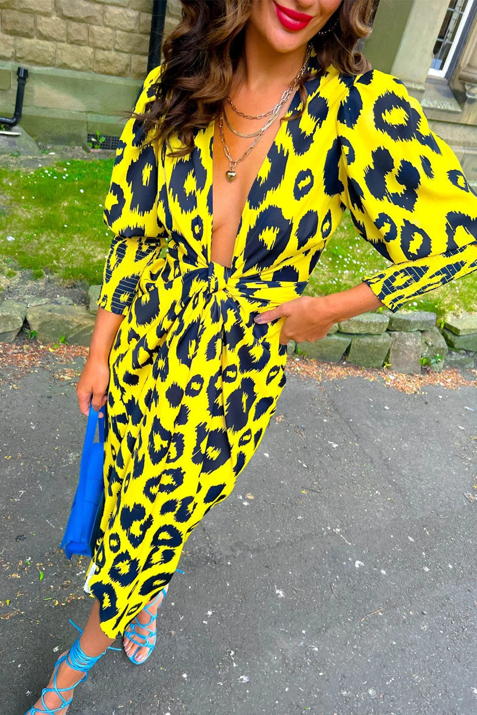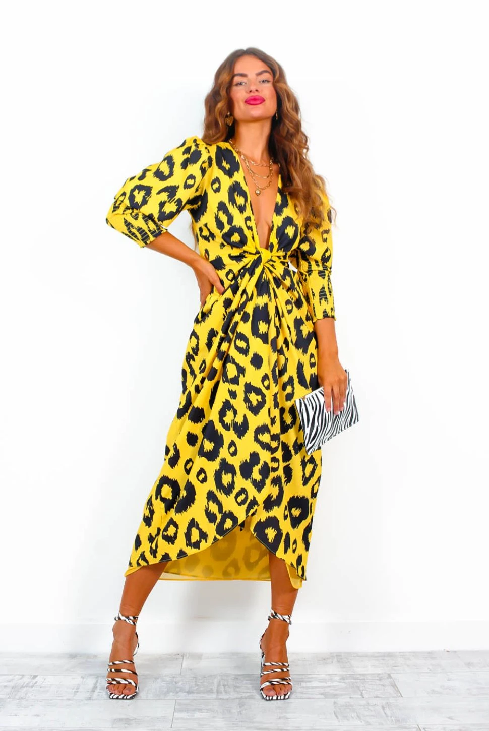 Kiss those what-to-wear dilemmas goodbye with this fierce yellow and black animal print midi wrap dress. A true fan fave with dramatic 3/4 length shirred sleeves, super versatile wrap waist that we love to tie plunged. It’s driving us wild! Slick on a contrasting red lip and chunky boots for a festival look we are love love loving.