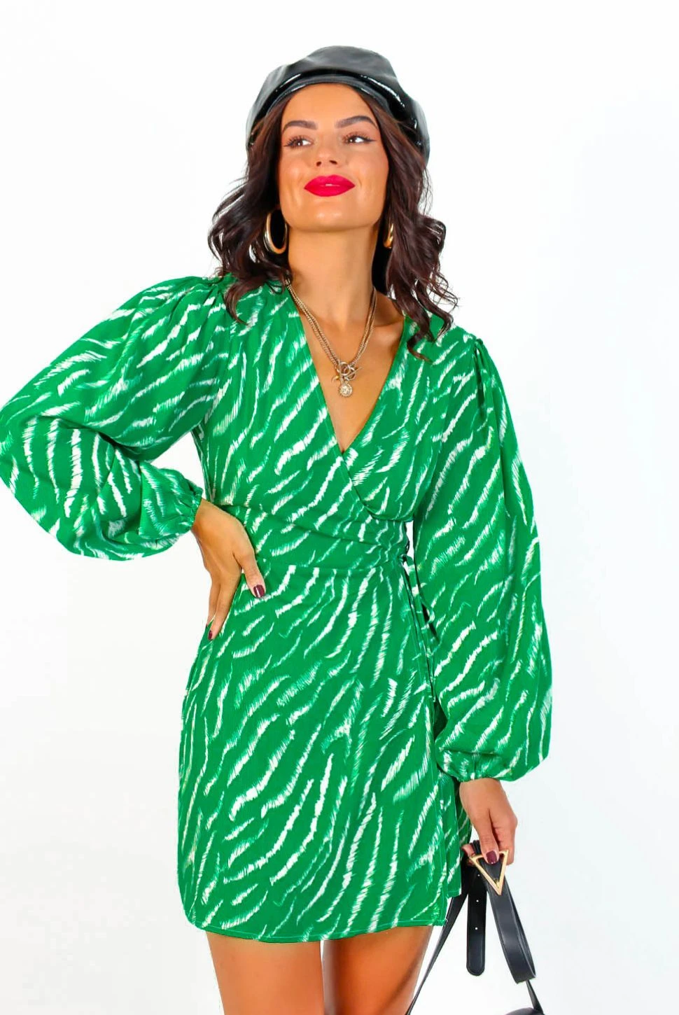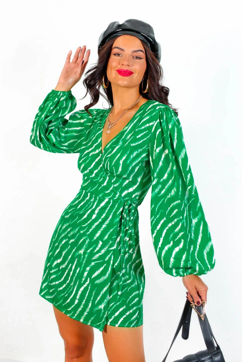 Our first love: animal print. This mini wrap features a bang on trend green zebra print design, wrap style fastening, floaty hemline, and cuffed loose sleeves. Style casual with chunky boots, and a leather jacket. Add a red lip for that pop of drama we live for.Â