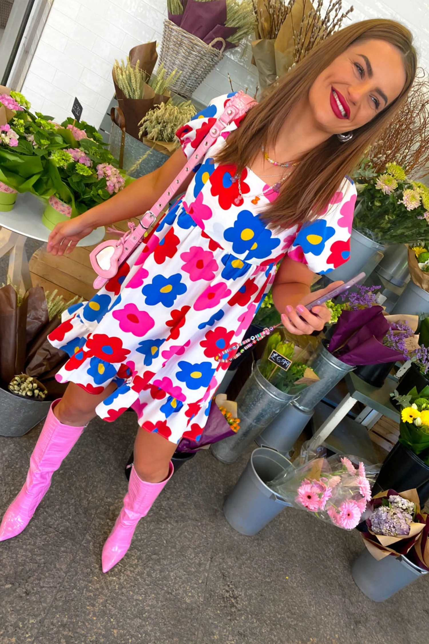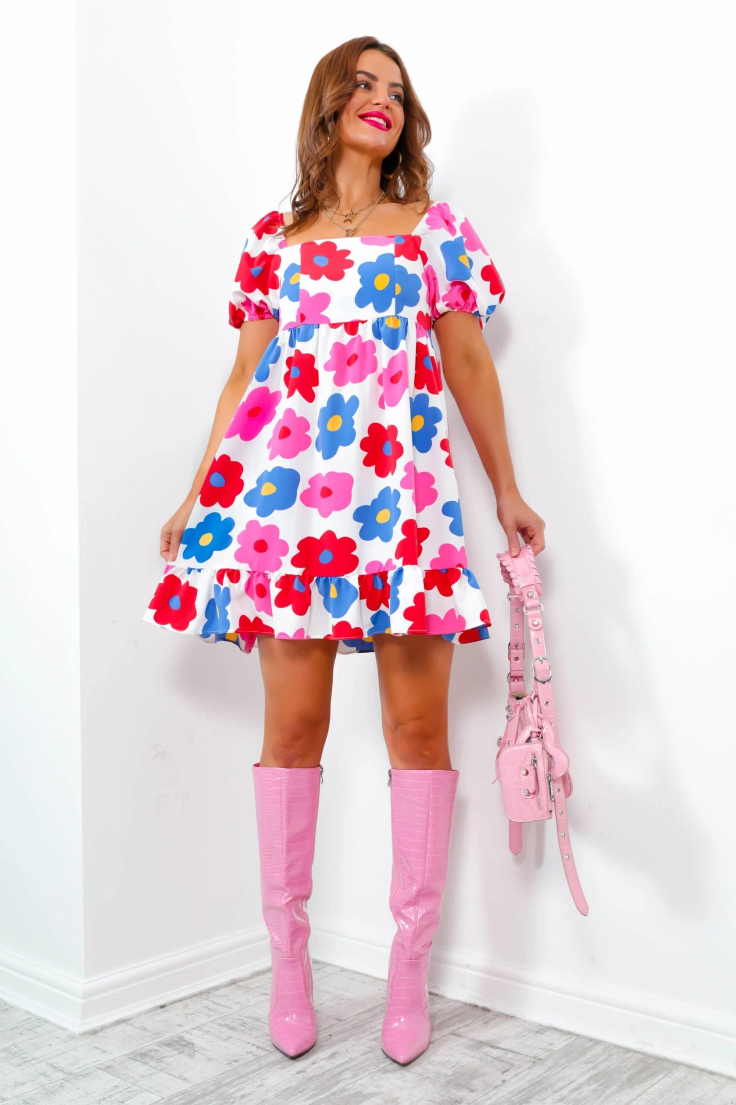 The 70’s called and they love your outfit. In the print of dreams, this super cutesy mini dress features a large floral pattern in pink, red, blue, and yellow. Featuring a square neckline, puffed elasticated sleeves, a floaty tiered hemline, and an elasticated back, this dress is fun, flattering and funky! Stick to the retro era and style with white heeled ankle boots and a bright bag, don’t forget those shaped sunnies to finish off the look.Â
