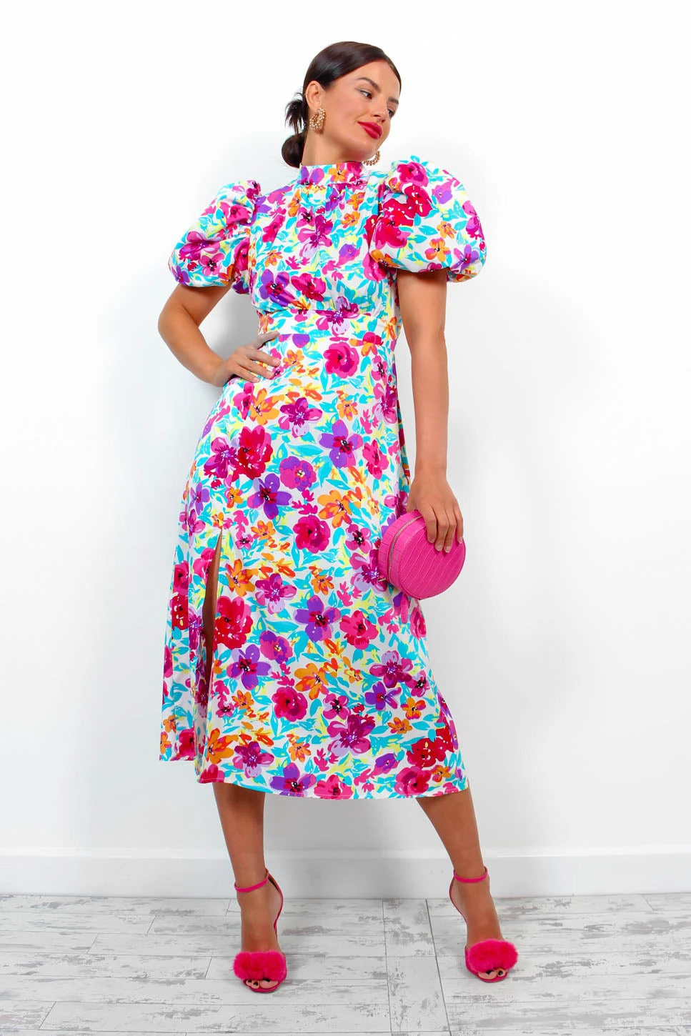 Have a spring fling in this elegant number! It features a mix of purple, pink and turquoise floral print throughout, short puffed sleeves, a high neck, and a split leg. Look no further for that dress you’ve been searching for all those special occasions, just add a pink heel and you’re ready to stun!