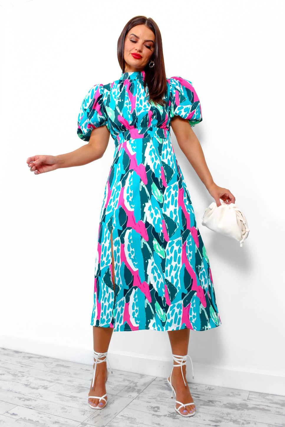 For the dolls who wanna make an entrance. This sophisticated number features a turquoise, green, and fuchsia abstract print, short puffed sleeves, a high neck, and a split leg. Fuchsia is our favourite colour and this dress would go perfectly with some strappy heels and a little mini bag for your besties hen weekend!