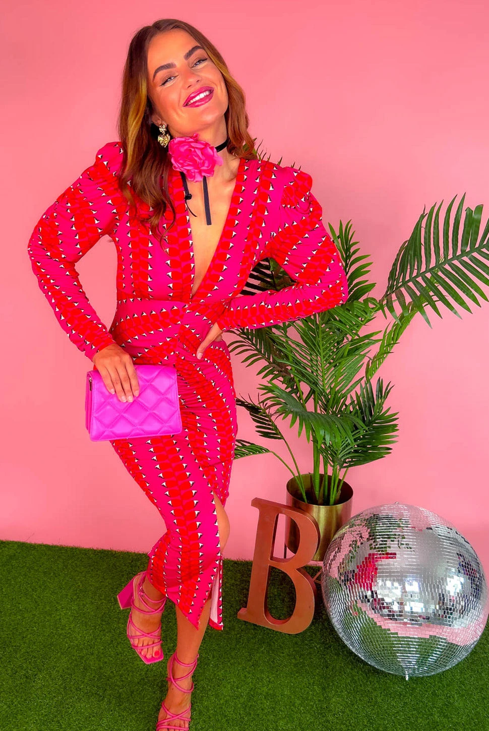 If I was you, I’d want to be me too! In romantic hues of pinks and red prints throughout, this daringly plunged midi dress is complete with statement long sleeves that ooze pure sophistication and a ruching detail to enhance and contour your curves. Let them know you’ve arrived as you strut into the room in all matching red accessories.