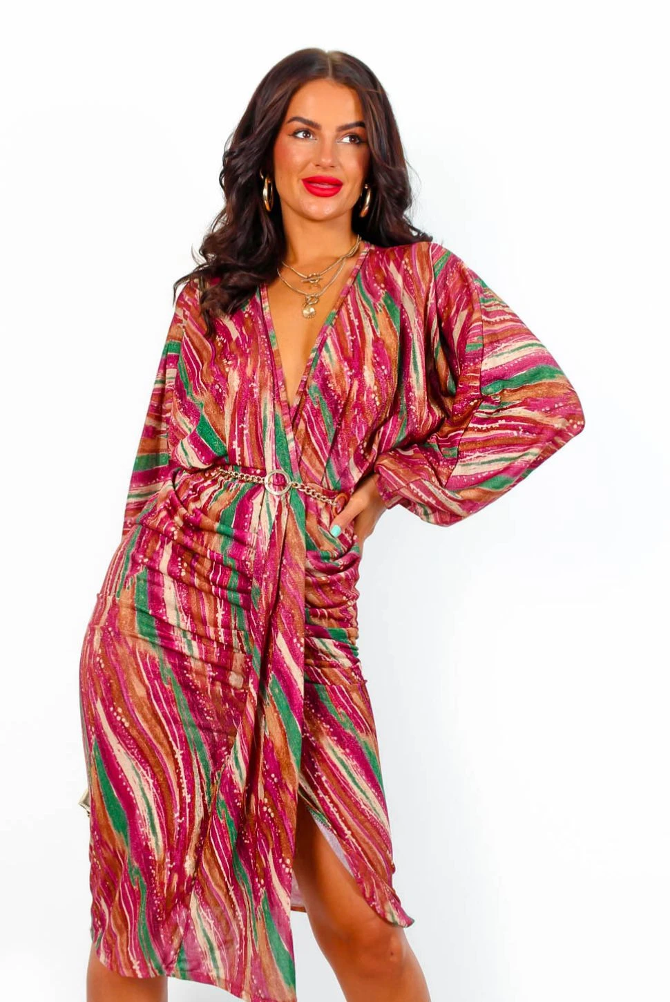 Totally falling for this dress. This midi comes in a dark burgundy brushstroke print with glitter throughout, batwing style sleeves and a draped style front. Take it to that fancy dinner you’ve got coming up in gold everything!