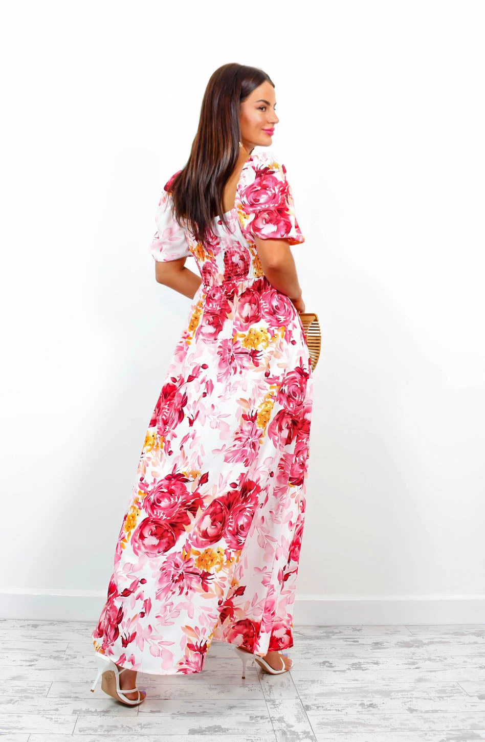 Whether you’re off to the tropics or having your annual garden party, this dress can be dressed to the nines or give laid back vibes. Featuring a pink watercolour floral print with pops of orange, puff sleeves with tie neckline and a fierce leg split. Perfect for stealing the limelight in gold accessories.Â
