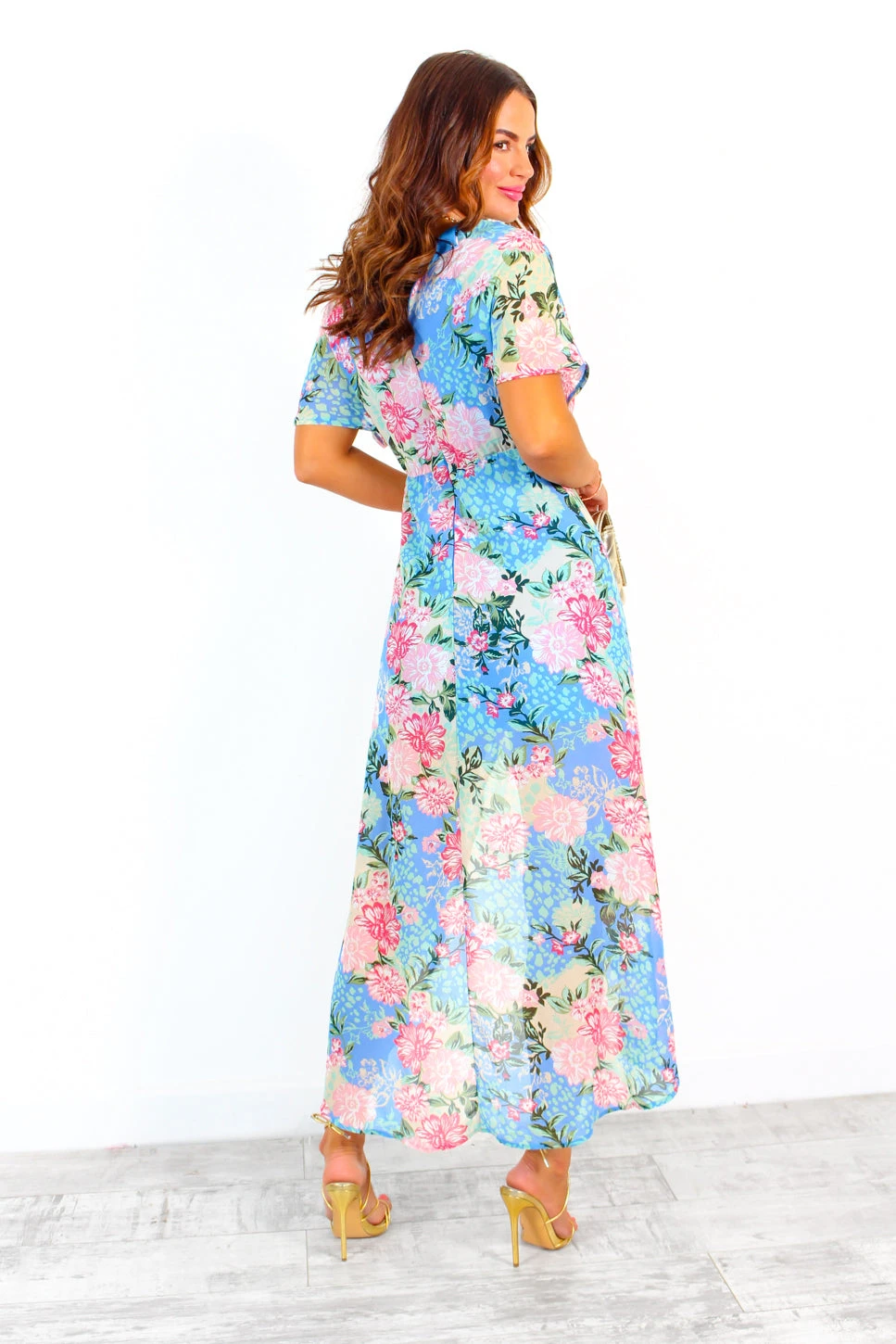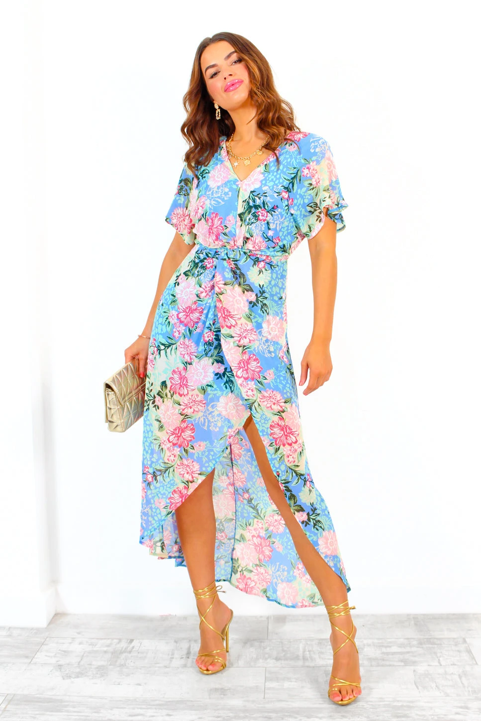 Not knot falling in love with this dress. This gorgeous piece comes in a sheer lined floral fabric featuring gold glitter detail threads, a v-neckline leading into front knot detailing and complete with short batwing style sleeves. Pastel green heels is a definite vibe for this lil number and you’ll feel like a total queen wherever you wear it.