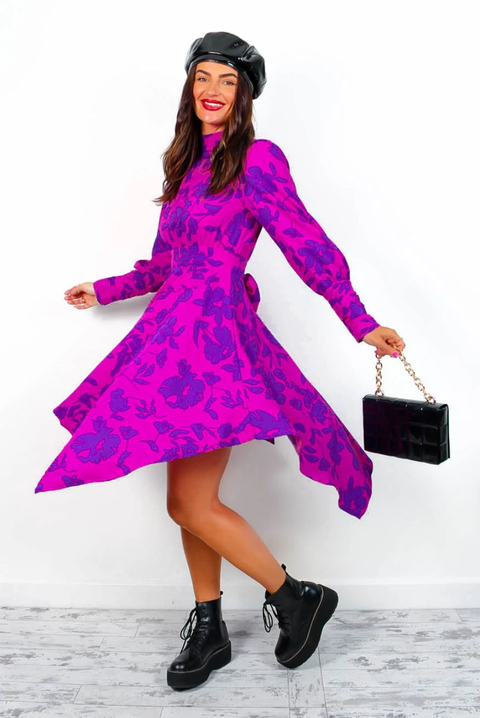 Don’t be the kind of gal who leaves no trace, make a statement in this stunning magenta and purple floral print mini dress! Featuring a belt tie waist to flatter your silhouette, long buttoned cuff sleeves and flowy asymmetric hem. Pair with a popping pink heel and bag, and you’re ready to go.