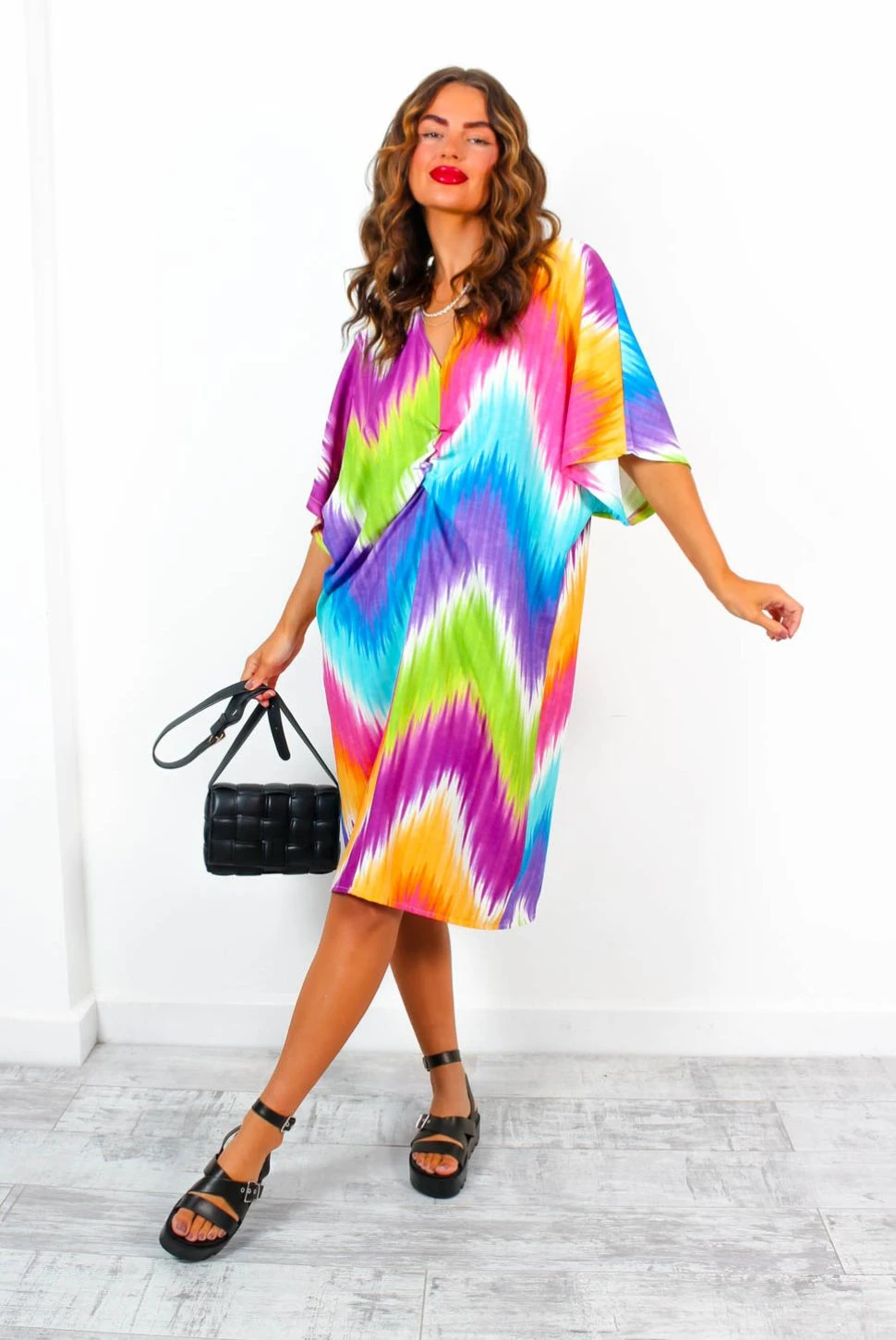 Why pick only one colour when you can have ’em all? Get ready to slay and make every day a fabulous fashion fiesta in this oversized midi dress. In a vibrant rainbow print with ruched detailing, it’s the perfect go to for a beach cover up or walks in the park on sunny days. Throw on with chunky trainers and oversized sunnies for ice cream dates in the park!