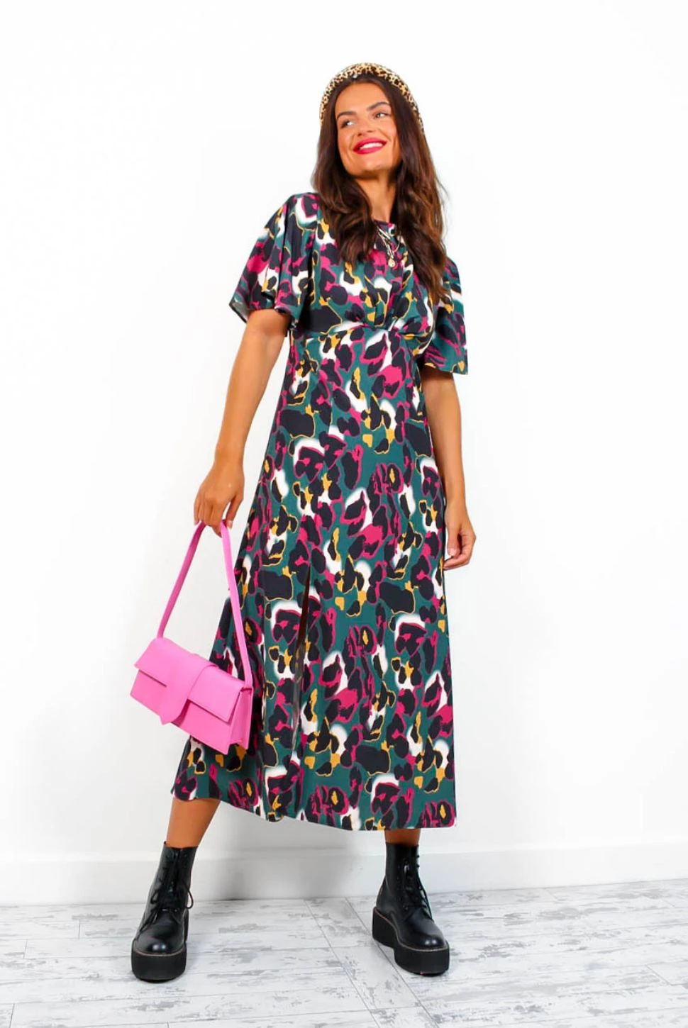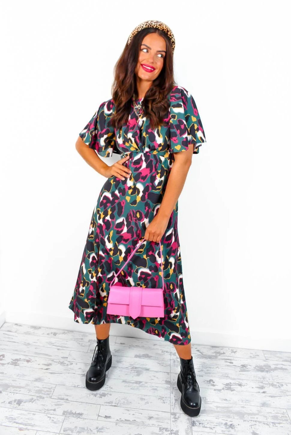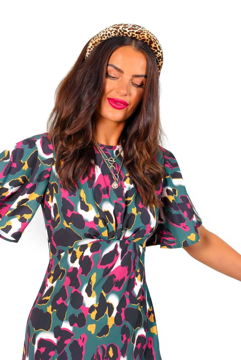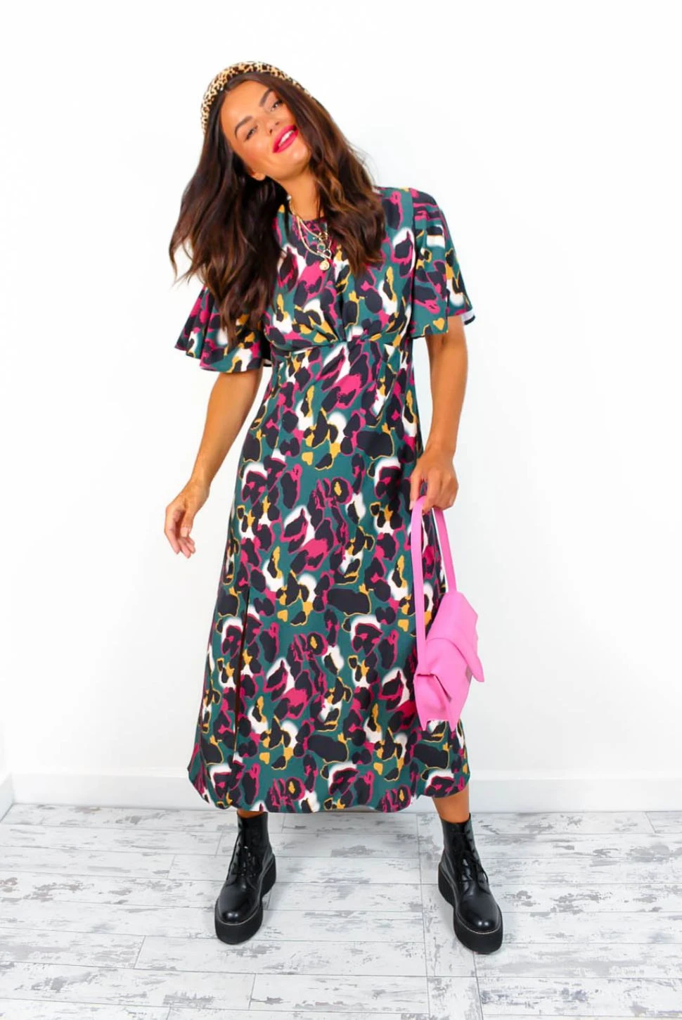 Sass up your new season wardrobe! This well loved midi dress features a forest leopard print throughout, front leg split, short ruffled sleeves, and back zip. Ideal for dressing up or down, style with a leather jacket and chunky boots, or amp it up in heels and a clutch for those tipsy plans.