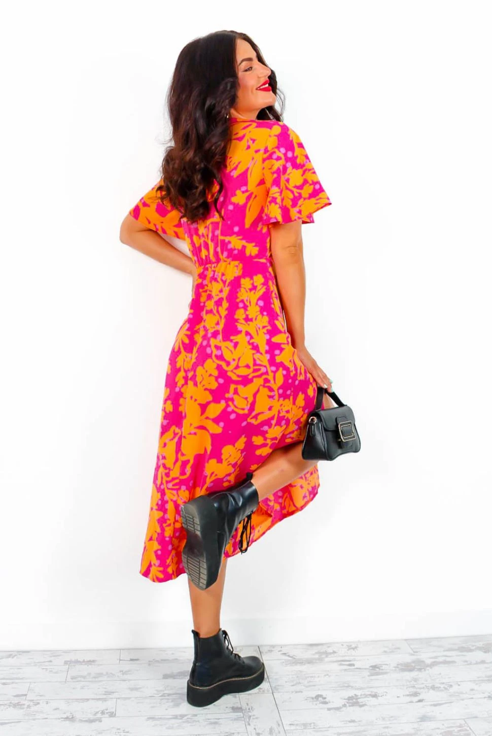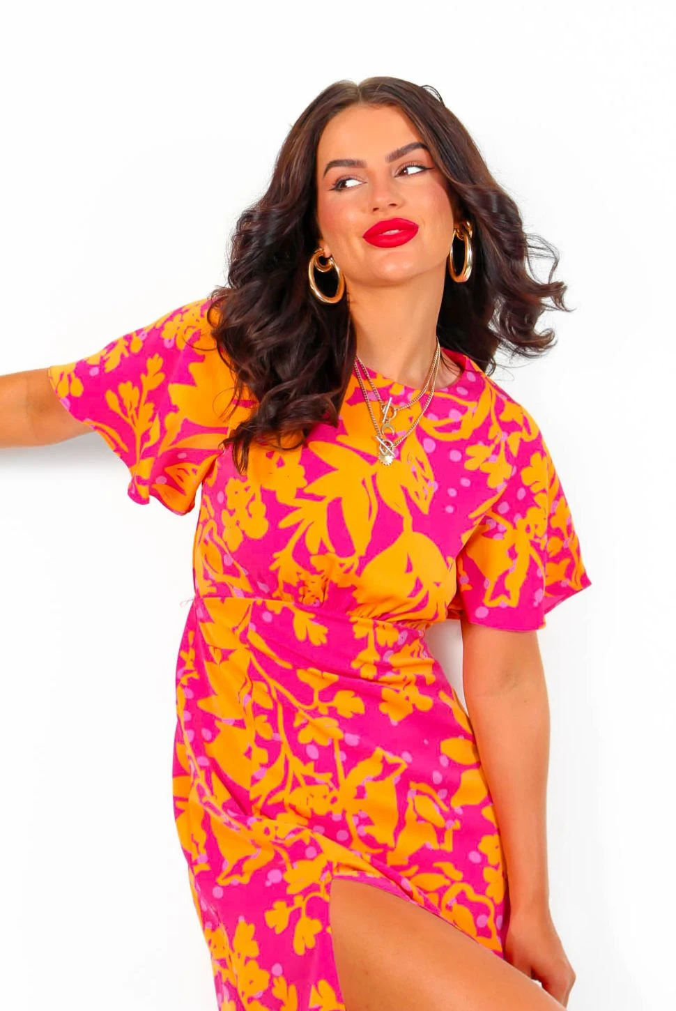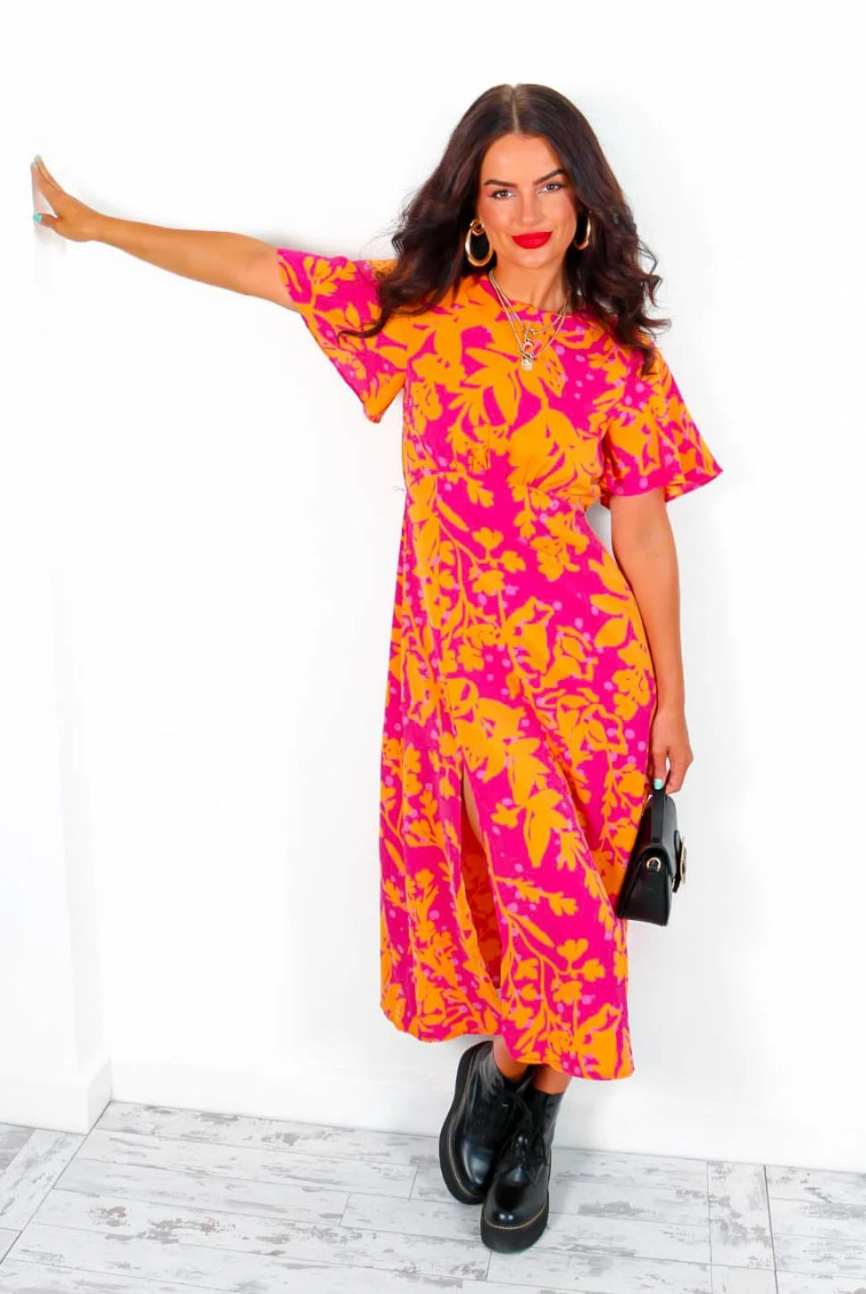 We are in love with pink and orange this season, it’s contagious! This tropical print midi dress features short floaty sleeves, a rounded neckline, zipped back, a flattering under bust seam, and that iconic leg split. You’ll have the room feeling tropical from the moment you step through the door! Pair with orange stiletto heels and a matching clutch.