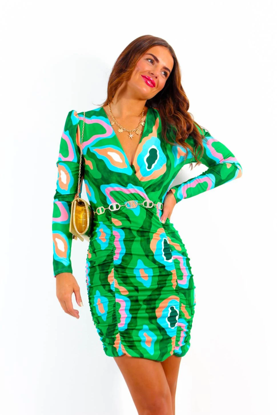 Bright, bold and bursting with personality – that’s the way we like it, Doll! With flattering ruched detail throughout, a daring plunged neckline and a figure hugging bodycon fit, this mini dress will certainly be joining us for brunch with the besties. Complete with long sleeves and a funky green, blue and pink abstract print – we are obsessed. Colour clash like a queen with pops of pink accessories and a matching lip!