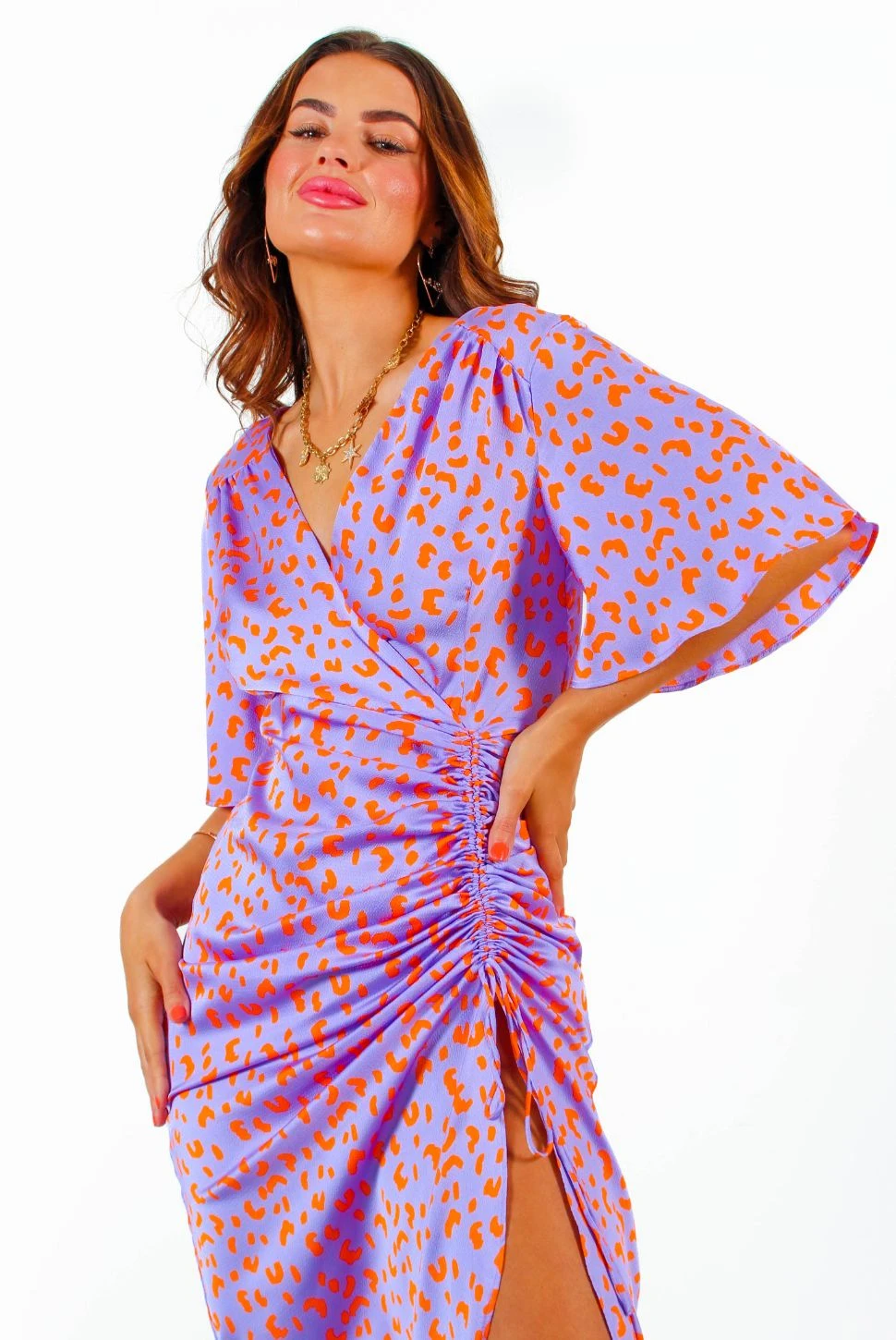 She’s the best yet, and yet, her best is yet to come. If you’ve been looking for the one that is sure to turn heads, look no further! In a midi length, roaring in zesty orange leopard print, this lilac satin dress is giving us total Spring luxe vibes. With adjustable ruching detail and flowing kimono style sleeves – it’s got to be the one! Make those colours pop with vibrant orange accessories and lashings of stacked gold jewellery.Â