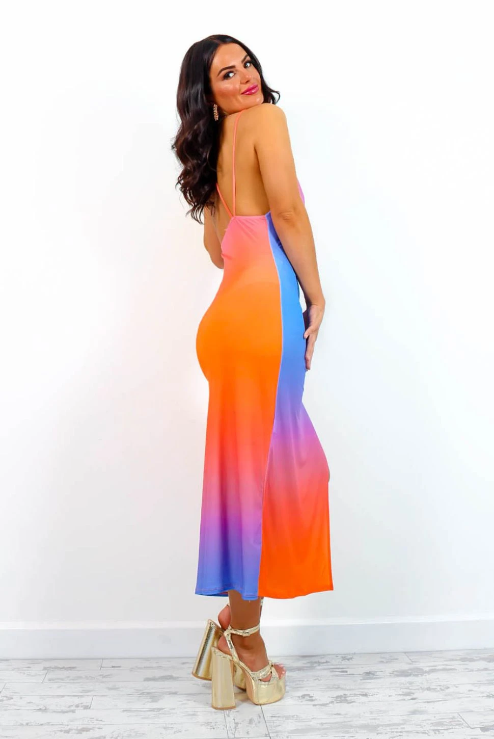 Lookin’ like a flame, cos your style is on fire. This slinky midi dress features a blue and orange ombre design, a cowl neck, v-style spaghetti straps, slight ruching, and a beautifully daring thigh split. Lookin’ like a sunset, this is the perfect holiday dress.