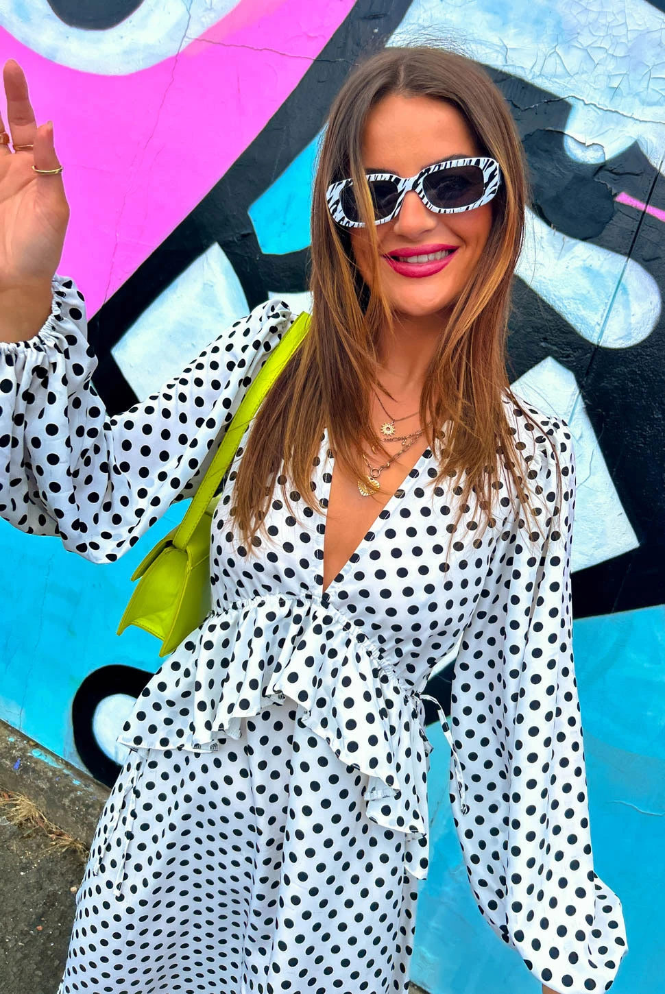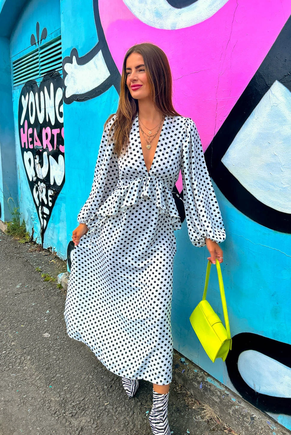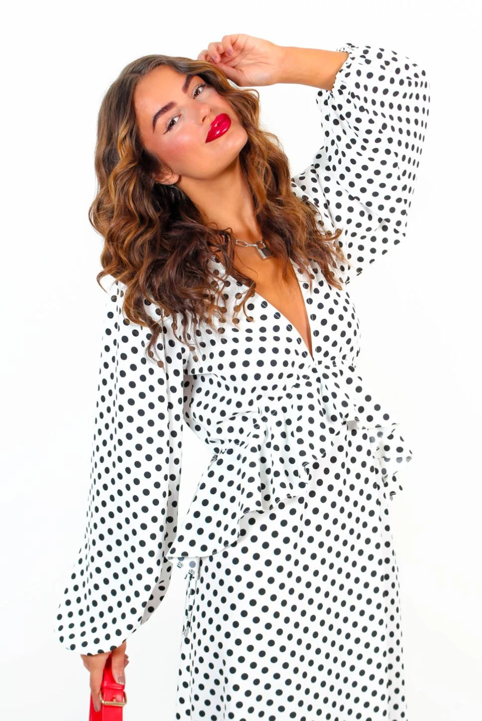 We’re dotty for spots! Be the belle of the brunch ball in this beaut black and white polka dot midi dress. This sassy-but-totally-classy style features an all-over monochrome spot print, V-neck, and high-volume high-drama balloon sleeves. Turn every head with the fun frill waist detail and sling on colour pop accessories for a high contrast look to get you noticed noon or night!